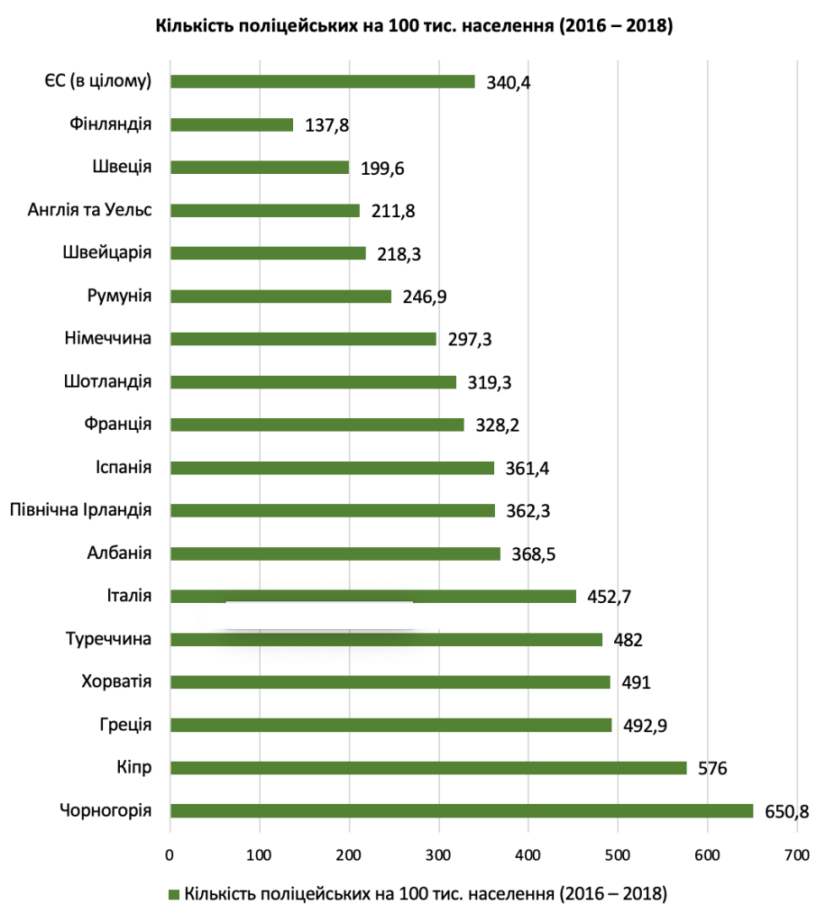 Так, у 2012 році Чорногорія мала 677 поліцейських на 100 тис. населення, Сербія – 635, Іспанія – 533, Туреччина – 524, Росія – 515, Греція – 513, Хорватія – 477, Італія – 456, Вірменія – 455, Португалія – 455, Мальта – 443.