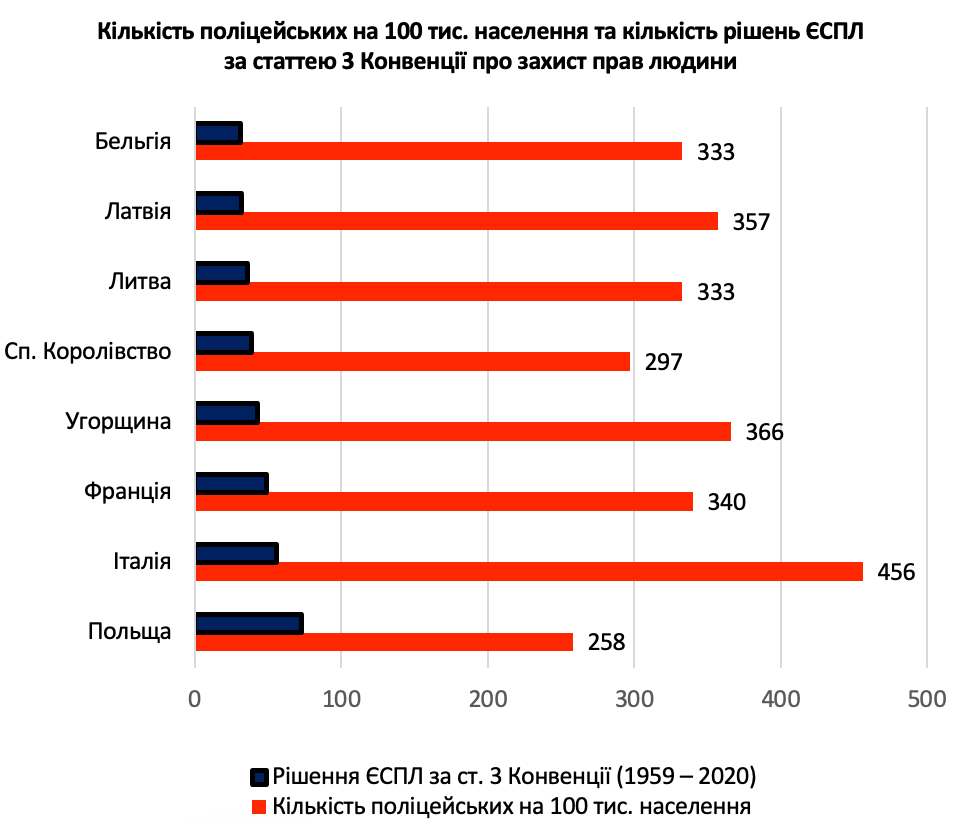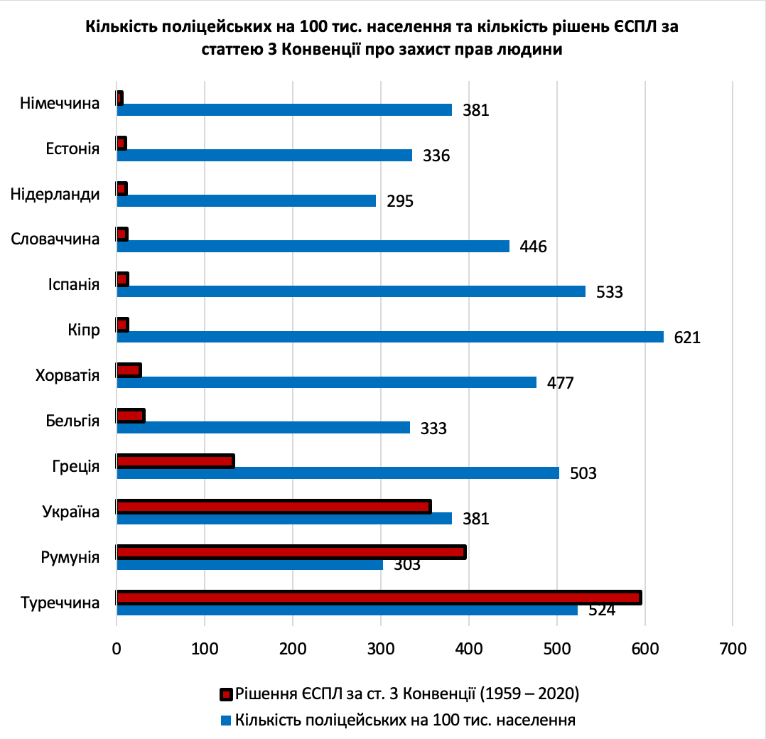 Так, приклад Німеччини, Кіпру, Іспанії та Словаччини з великою кількістю поліцейських на душу населення з надзвичайно низькими показниками звернень громадян до ЄСПЛ зі скаргами за статтею 3 Конвенції суперечить прикладам України, Румунії та Туреччини, які мають приблизно аналогічну кількість поліцейських на душу населення, проте водночас залишаються лідерами за кількістю скарг про катування та інші форми нелюдського поводження.