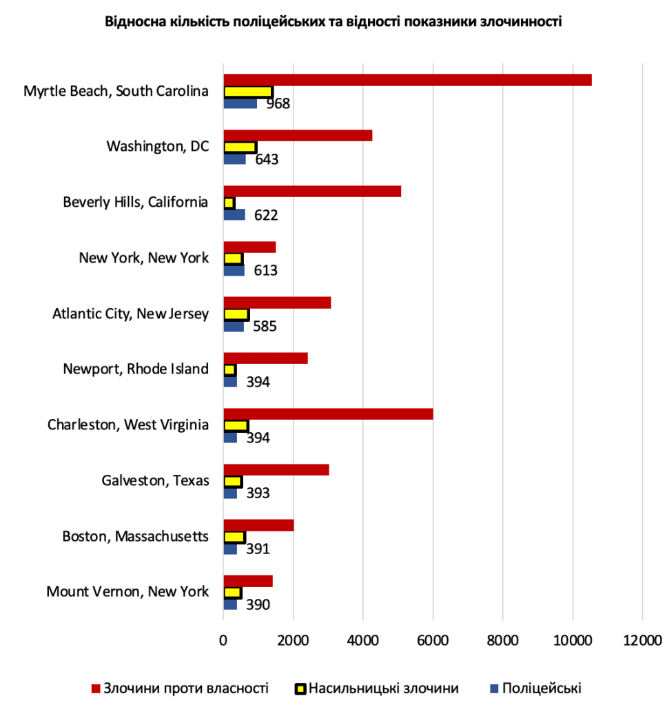На поданій нижче таблиці представлено дані щодо рейтингу 50-ти американських міст з найбільшою кількістю поліцейських на 100 тис населення та кореспондуючими показниками насильницьких злочинів і злочинів проти власності на 100 тис. населення [11].
