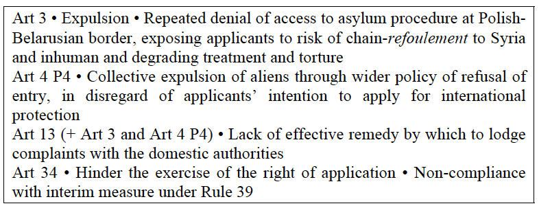 Той факт, що п’ять разів, коли заявники були присутніми на польських прикордонних пунктах, не було порушено жодного провадження, що стосується розгляду заявників про міжнародний захист, і що, не зважаючи на їхні твердження щодо ризику «ланцюгового вислання», по кожному з тих випадках заявники були повернуті з польського кордону до Білорусі, що було порушенням статті 3 Конвенції (п. 69).
