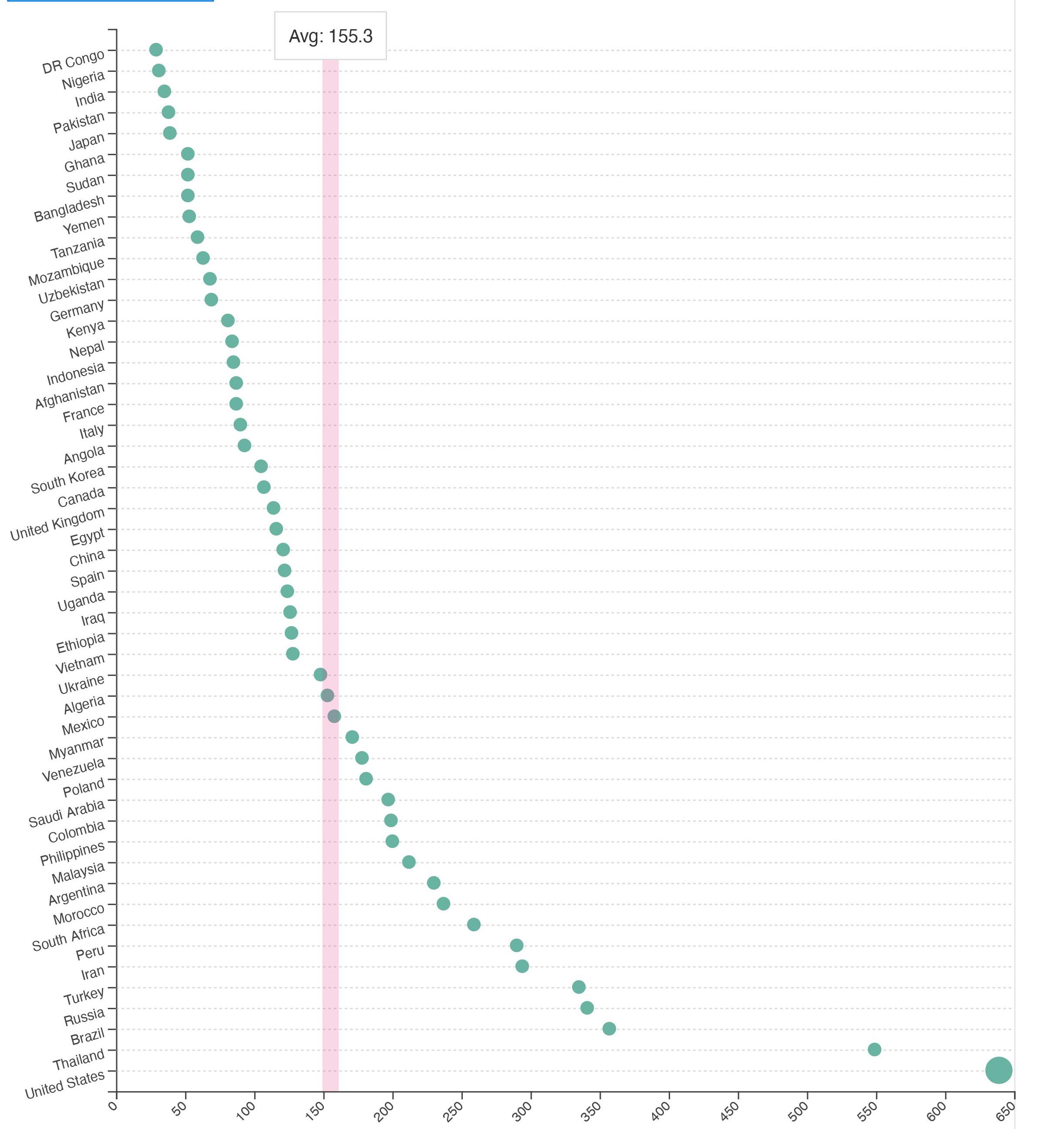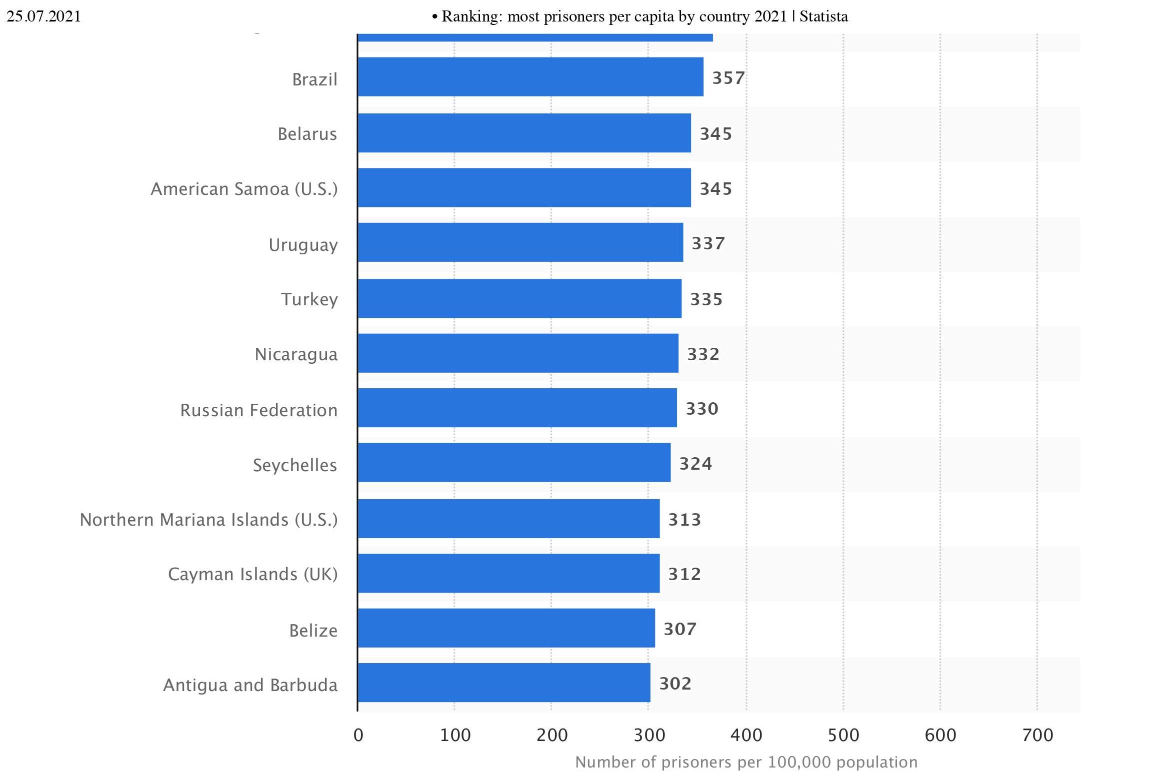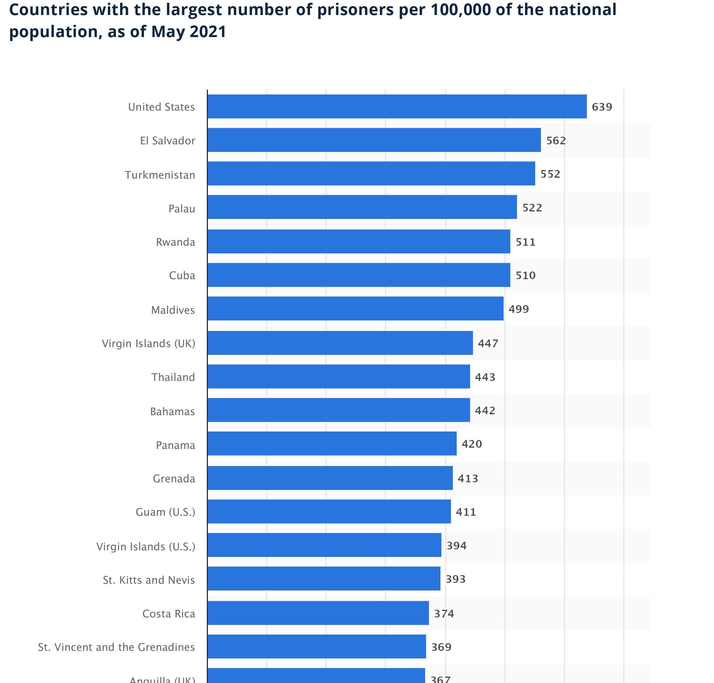 Станом на травень 2021 року в США був найвищий рівень ув’язнених – 639 ув’язнених на 100 000 населення.