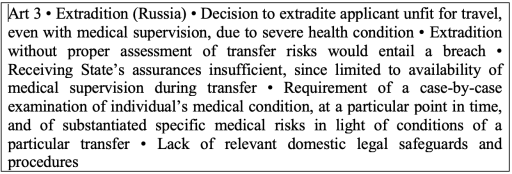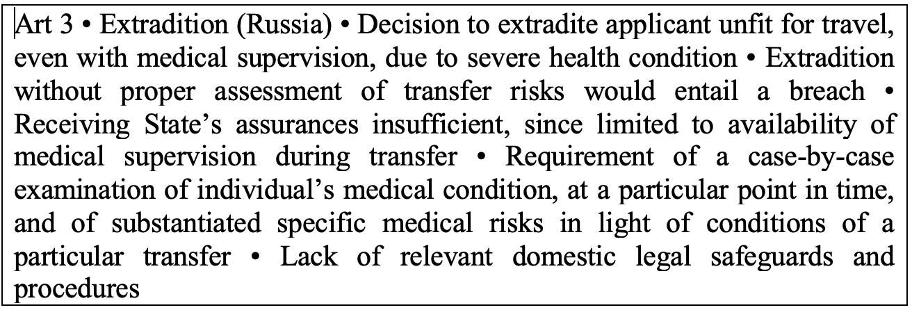 Звідси випливає, що мало б місце порушення ст. 3 Конвенції у випадку екстрадиції заявника до Росії без здійснення оцінки з боку вірменської влади, відповідно до цього положення, через наявність ризику, з яким заявник стикався б під час його транспортування у світлі інформації про стан його здоров’я (п. 110).
