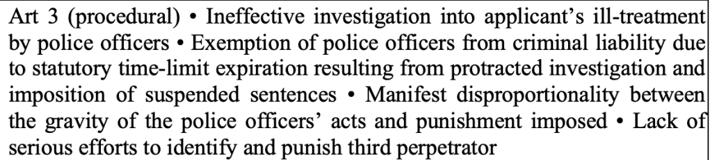 ЄСПЛ зауважує, що владі знадобилося майже 12 років – це необґрунтовано тривалий період – для проведення досудового розслідування та судового розгляду у кримінальному провадженні, яке закінчилося засудженням двох поліцейських, які піддали заявника жорстокому поводженню (п. 39).