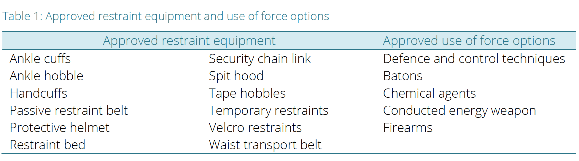 Це варіюється від використання наручників до активних фізичних обмежень, щоб примусити ув’язненого виконувати накази під час будь-якого інциденту.
