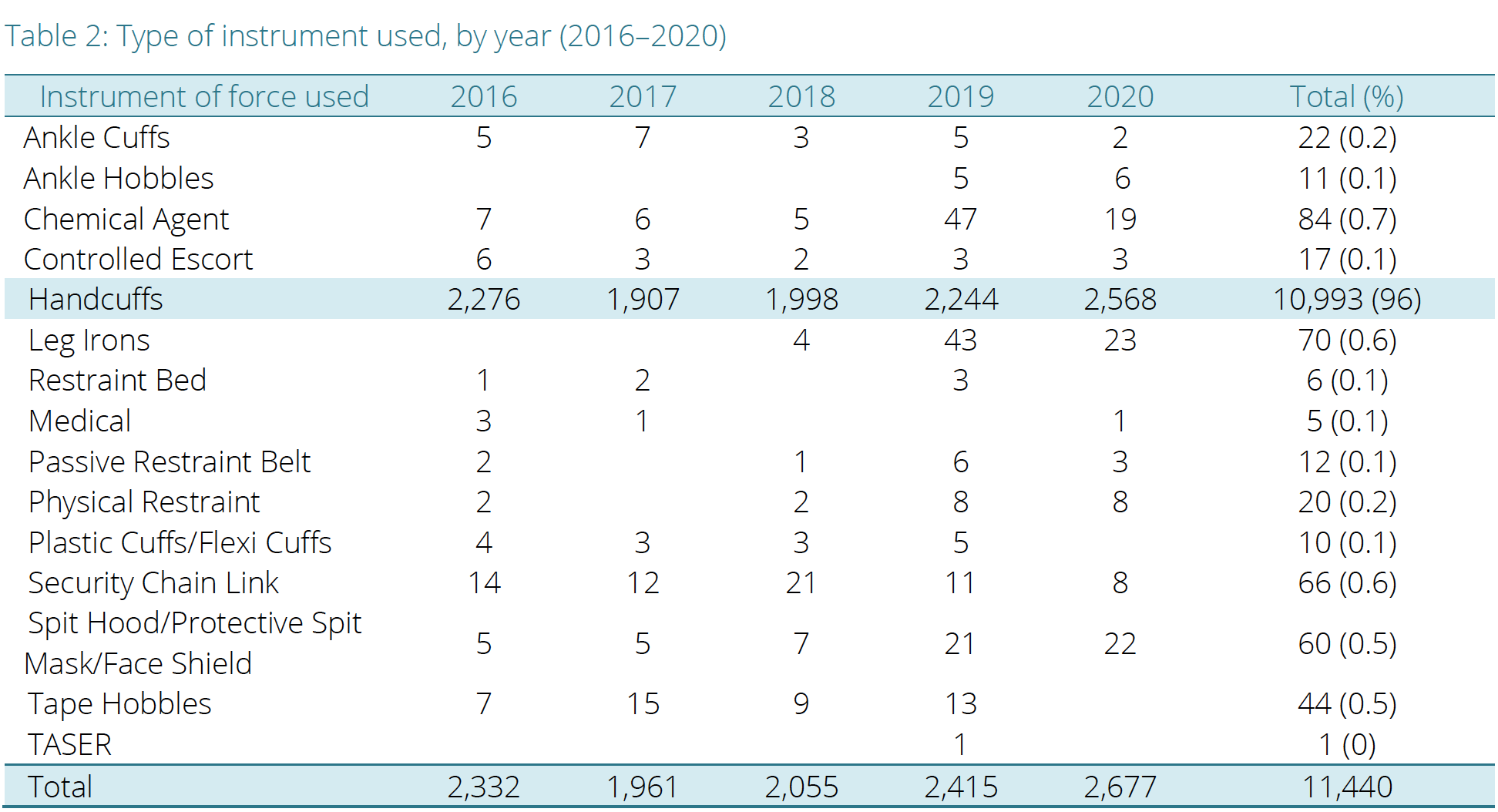 У період з 2016 по 2020 рік було зареєстровано 11440 випадків застосування сили у в’язницях Західної Австралії, що мало місце під час 9182 інцидентів.