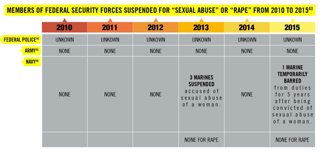 У 2016 році організація «Amnesty International» оприлюднила результати дослідження щодо причин, умов та обсягів нелюдського поводження щодо жінок у Мексиці під час поліцейських арештів та під контролем збройних сил.