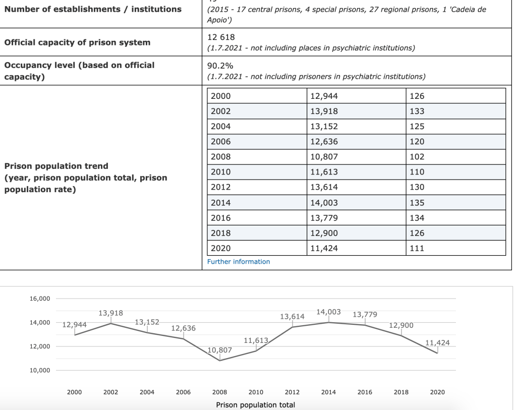Ситуацію у Caxias Prison ще більше погіршило переповнення (наприклад, 14 осіб у камері площею 33 м.кв.), де ув’язнені утримувались у своїх гуртожитках по 22 години на день. Подібна ситуація була характерною для утримання ув’язнених, обвинувачених у сексуальних злочинах у Setúbal Prison. Такі умови можна вважати рівними нелюдському та принизливому поводженню.