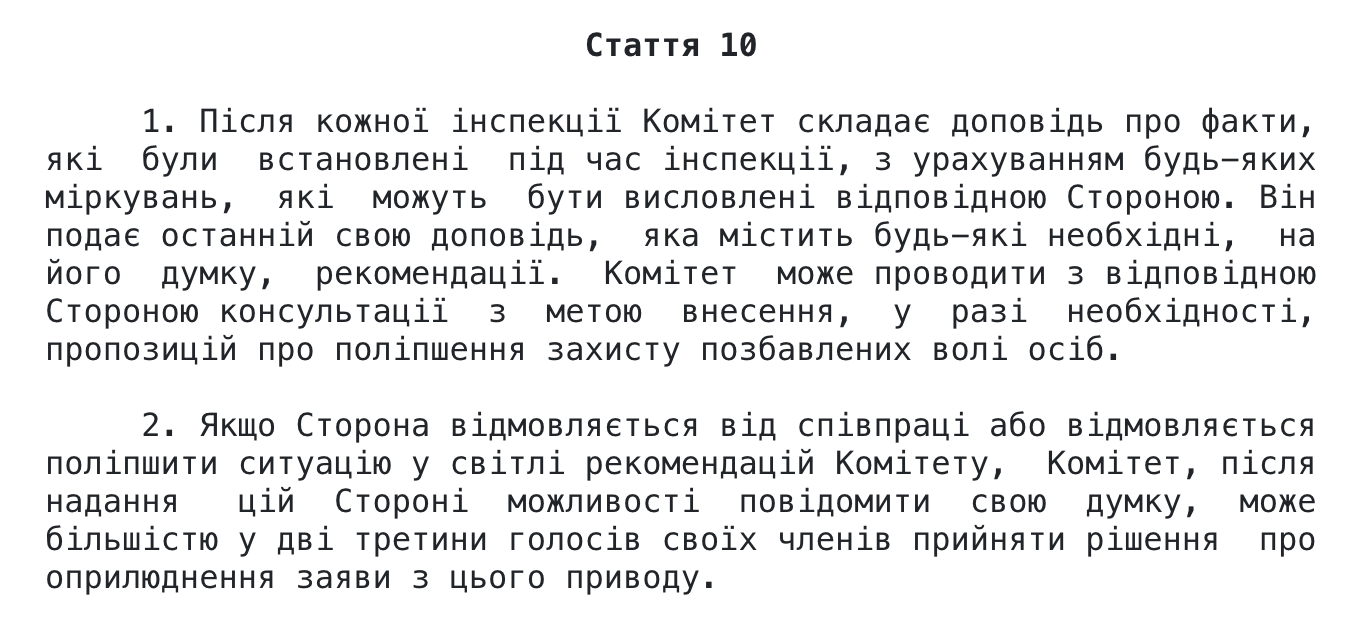 Комітет наголошує, що якщо польська влада не досягне прогресу щодо радикального покращення рівня її співпраці з Комітетом, у тому числі щодо впровадження давніх рекомендацій ЄКЗК, то Комітет може бути зобов’язаний звернутися до п. 2 ст. 10 Конвенції та зробити публічну заяву з цього приводу.