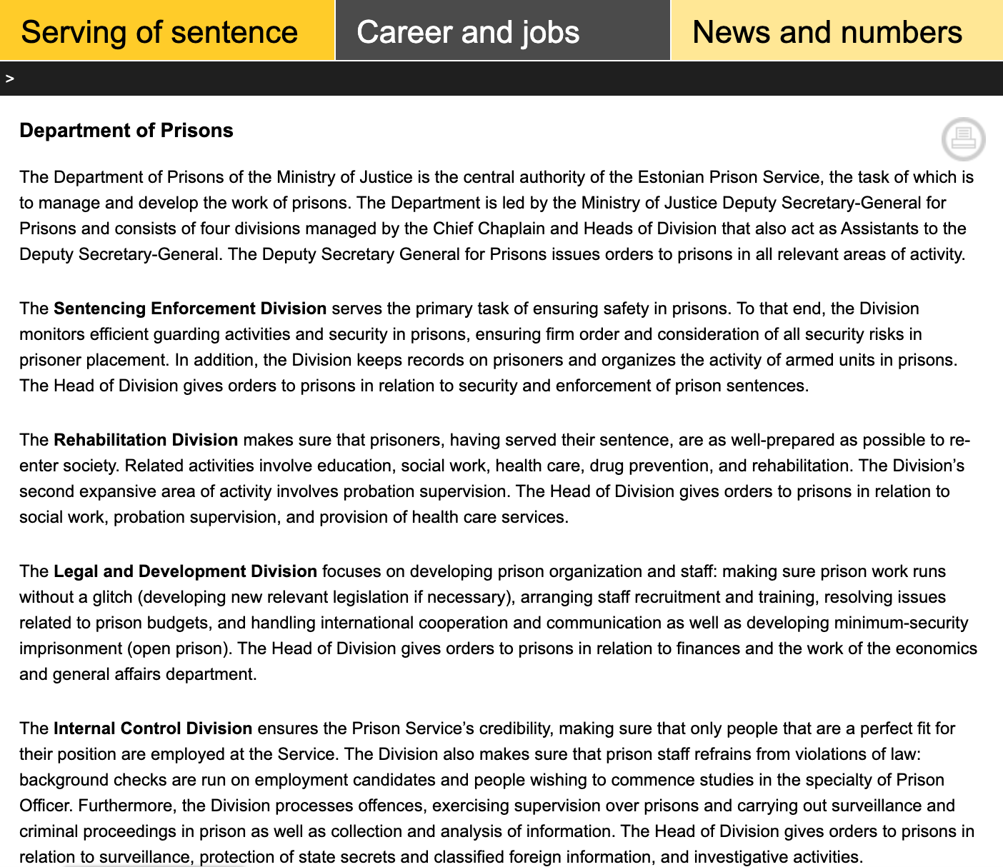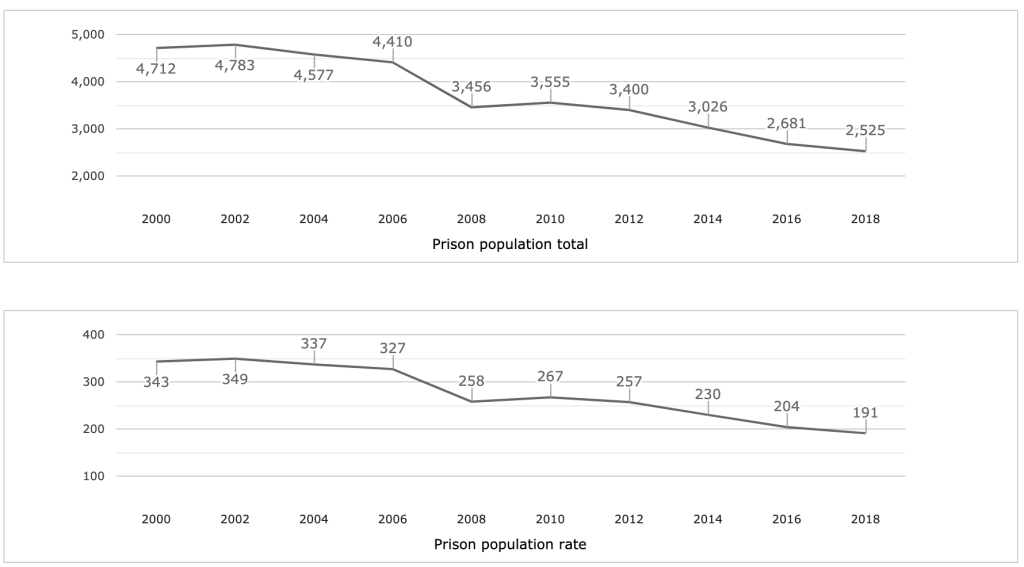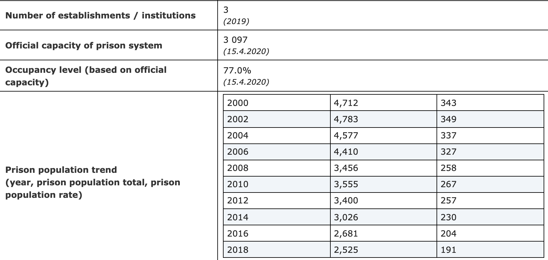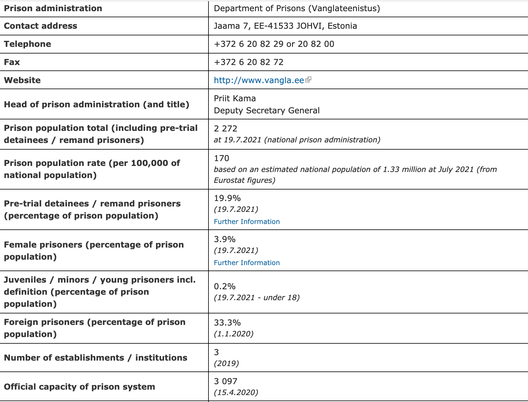 Комітет вітає заходи, вжиті естонською владою, щоб значно скоротити загальну чисельність ув’язнених після візиту Комітету, що мав місце у 2012 році (з 3389 до приблизно 2600). Тим не менш, Комітет наголошує, що Естонія все ще має один з найвищих відносних показників використання ув’язнення серед країн-членах Ради Європи (210 ув’язнених на 100 тис. загального населення).