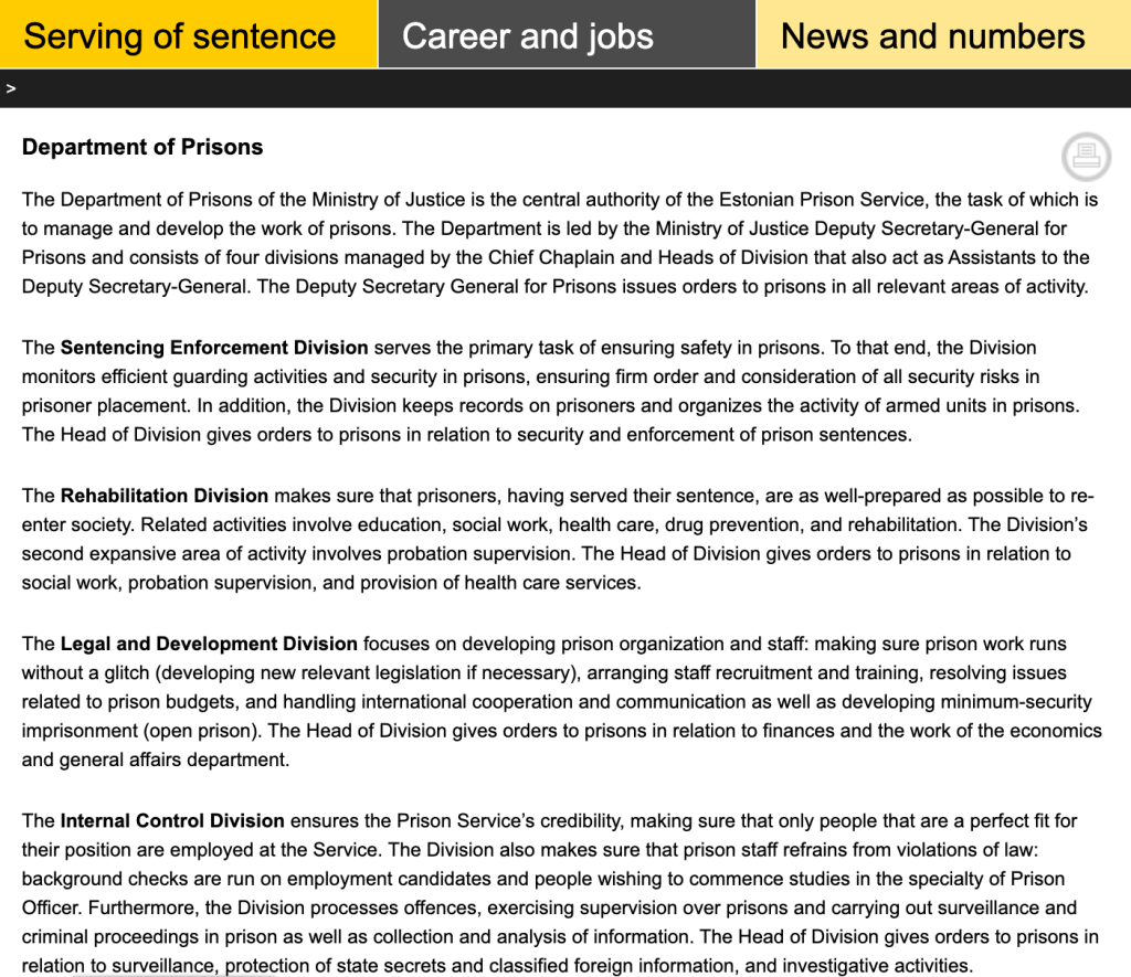 Тим не менш, у Талліннській в’язниці умови залишалися незадовільними (старі камери та жахливі санітарні приміщення), а багато засуджених ув’язнених досі утримувалися у тісних умовах (наприклад, до 10 осіб у камері площею 31 м.кв.).