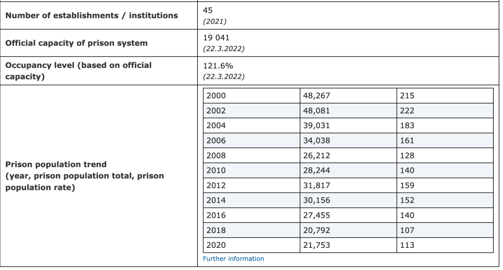 Комітет відзначає триваючі інвестиції у реформу пенітенціарної системи, як зазначено в оновленому Плані дій на період 2020 – 2025 рр. Незважаючи на це, виклики залишаються більш ніж суттєвими: покращення умов життя, пропонування низки цілеспрямованих заходів для ув’язнених, щоб допомогти їм підготуватися до реінтеграції у суспільство, збільшення кількості тюремного персоналу та забезпечення того, щоб медичні послуги у в’язницях відповідали потребам ув’язнених.