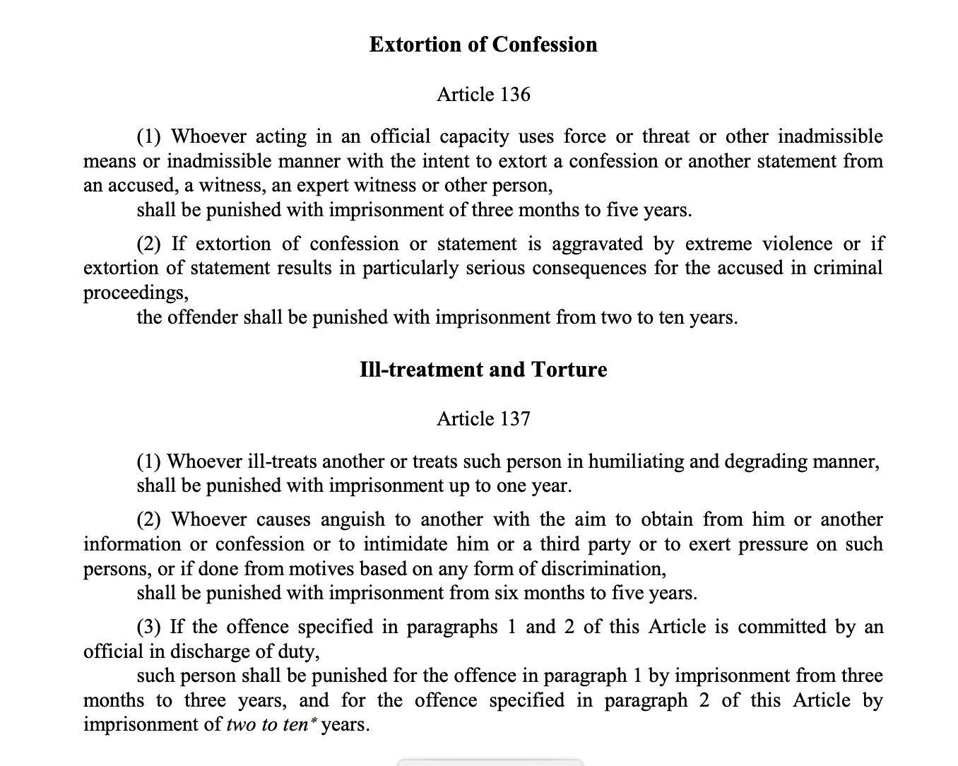 Делегацією було проаналізовано результативність розслідувань, проведених за заявами про жорстоке поводження з боку поліції, щоб визначити прогрес, досягнутий після візиту ЄКЗК у 2017 році. Аналіз численних слідчих матеріалів показав, що у дуже багатьох випадках прокурорські перевірки можливих порушень ст. ст. 136 – 137 Кримінального кодексу не відповідали критеріям результативності, викладеним у Методиці розслідування справ про жорстоке поводження, прийнятій владою Сербії у 2018 році. ЄКЗК вважає, що ст. ст. 136 – 137 Кримінального кодексу повинні бути змінені відповідно до ст. 1 Конвенції ООН проти катувань. Крім того, Коміте рекомендує, щоб прокурори та механізми нагляду за поліцією при проведенні розслідувань у випадках ймовірного жорстокого поводження були більш ретельними, всебічними та оперативними. Усі прокурори та слідчі повинні пройти навчання за Методикою розслідування випадків жорстокого поводження. ЄКЗК також висловлює занепокоєння щодо м’якості вироків, винесених судами поліцейським, засудженим за жорстоке поводження.