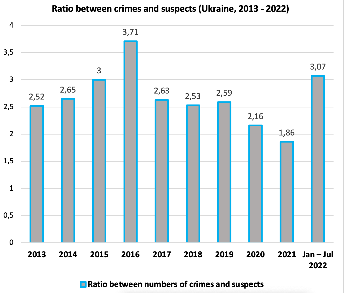 A facultative conclusion that could be drawn is that a ratio between committed crimes and detected suspects has a stable trend towards decreasing until the 2022 Russian invasion.