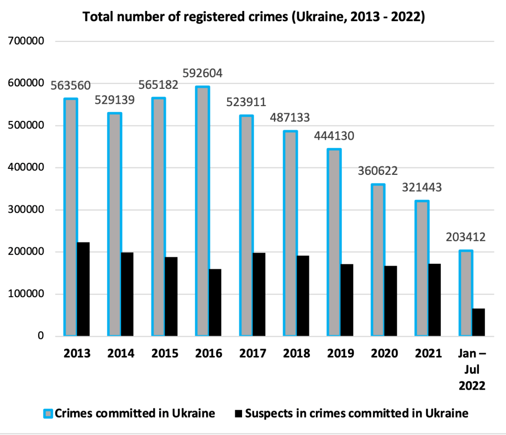 - having more or less stable total crime rate during 2013 – 2016, there had been a stable and permanent decrease from 2016 until the 2022 Russian invasion started;