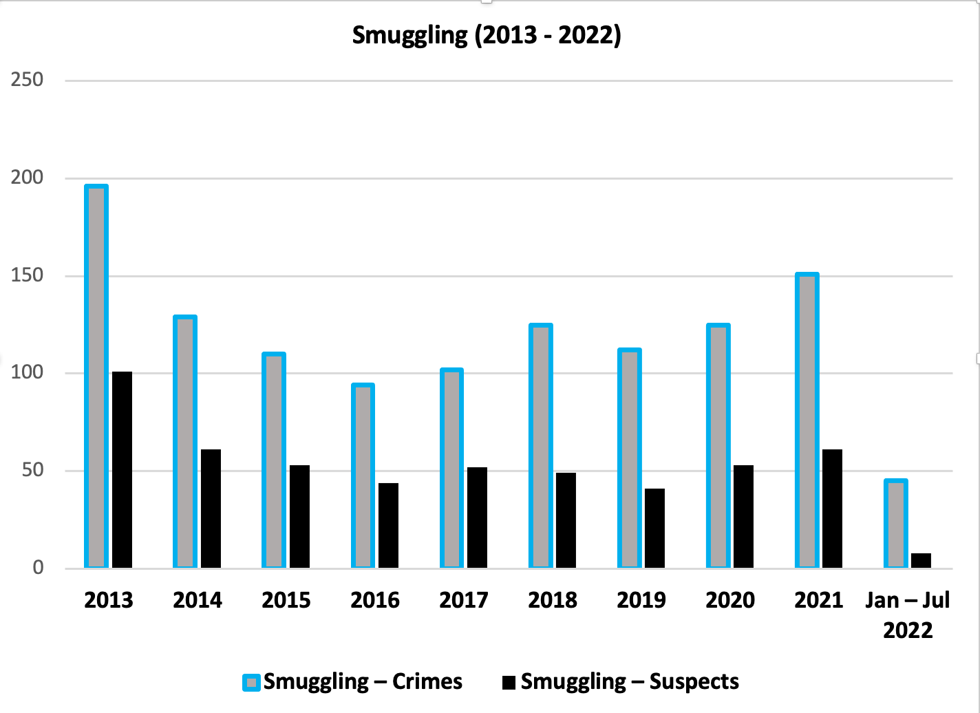 У порівнянні з аналогічним періодом 2021 року кількість розкритих злочинів зменшилася у 2,6 рази. Відповідно кількість підозрюваних у контрабанді за цей же період зменшилась у 4,75 рази.