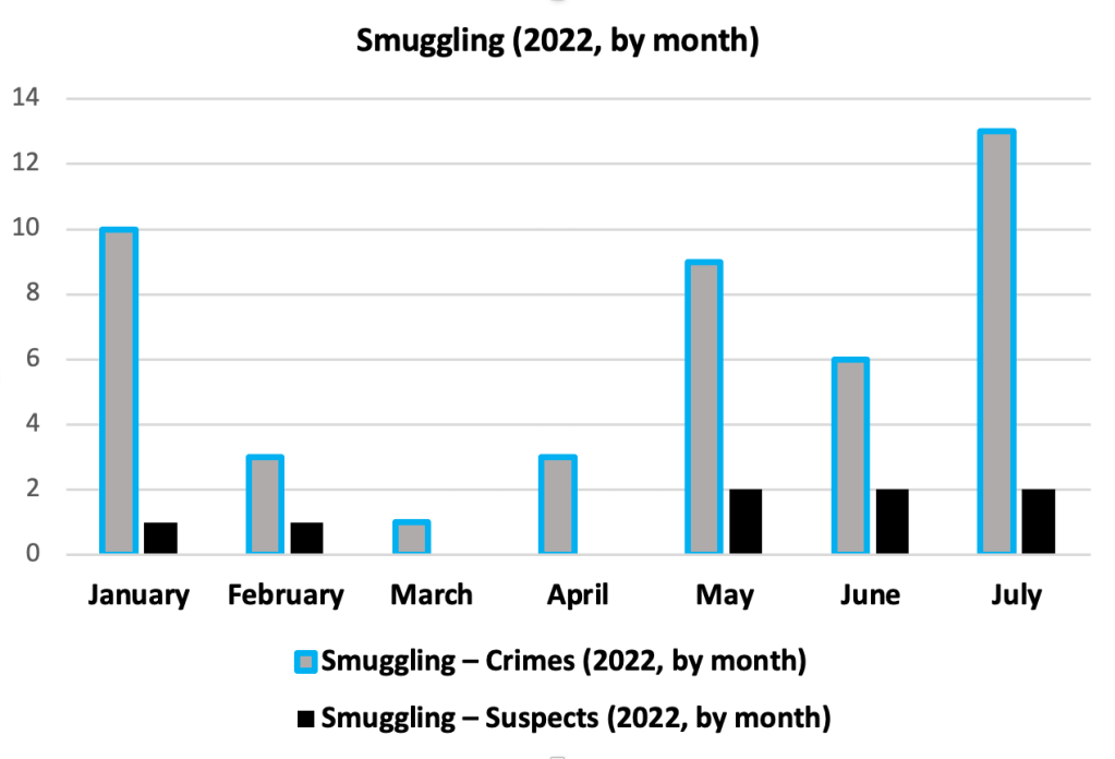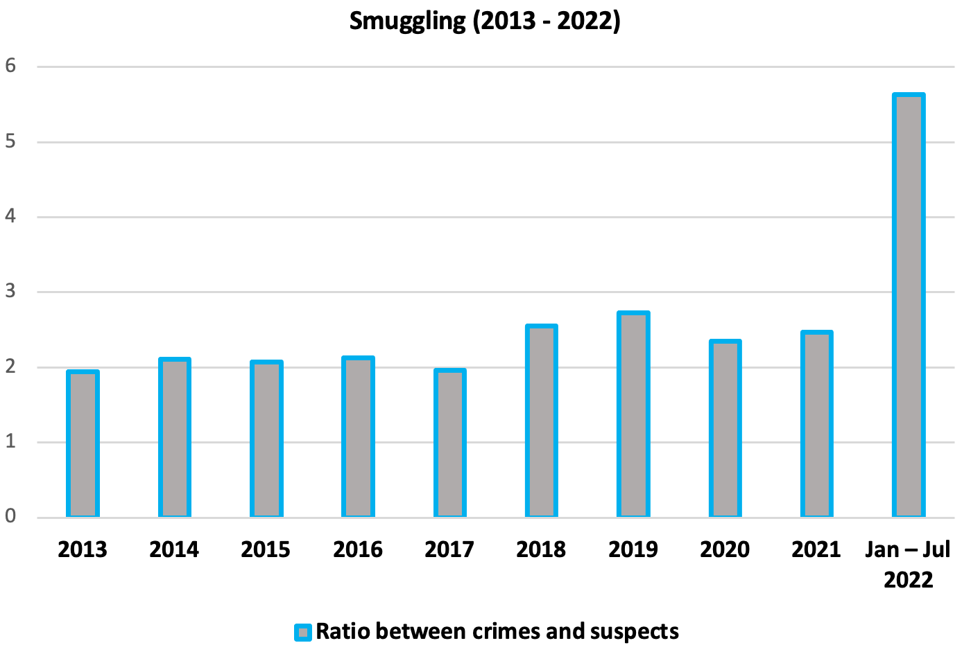 З іншого боку, різкий шок, спричинений російським вторгненням у 2022 році та призвів до зменшення розкритих злочинів контрабанди, ймовірно, незабаром зникне, враховуючи швидке зростання розкритих випадків контрабанди у середині 2022 року. Так, кількість злочинів контрабанди у липні 2022 року перевищила аналогічний показник січня 2022 року.