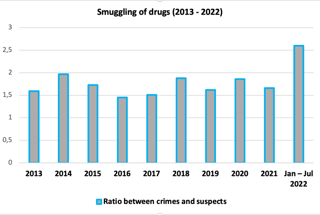 For the period of 2013 – 2021, an average ratio between detected crimes (including so called ‘factual cases’) and criminal proceedings with concrete suspects was 2,25.