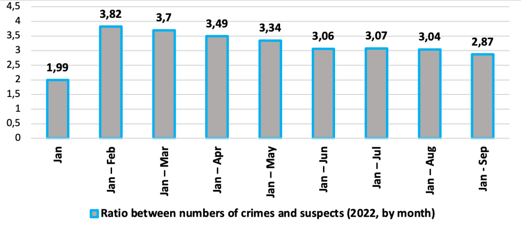 Таблиця нижче чітко демонструє вплив вторгнення 2022 року на систему кримінальної юстиції України, коли показники розкриття одразу впали в лютому 2022 року. Статистичні дані показують, як система кримінальної юстиції виходила з кризи, повільно зменшуючи різницю між злочинами та підозрюваними. Проте навіть у вересні 2022 року кримінальна юстиція не змогла досягти показника січня 2022 року.