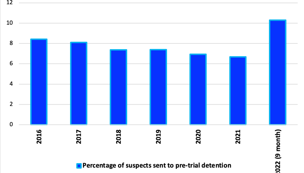 Крім того, за дев’ять місяців 2022 року спостерігається постійна тенденція збільшення підозрюваних, взятих під варту під час досудового розслідування навіть в абсолютних цифрах.