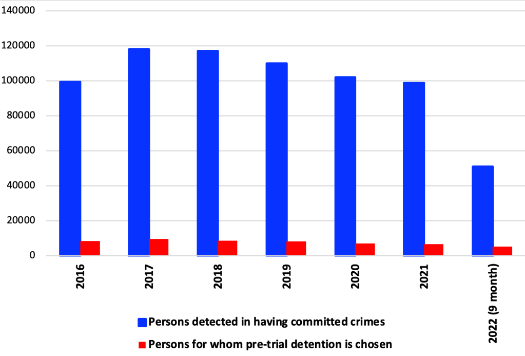 In the period of nine months of 2022, there has been a permanent trend of increasing of suspects arrested during pre-trail investigation even in absolute numbers.