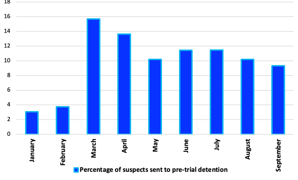 Якщо за січень-лютий 2022 року було взято під варту лише 3,4% підозрюваних, то за березень-вересень 2022 року такий же показник становив 11,7%.