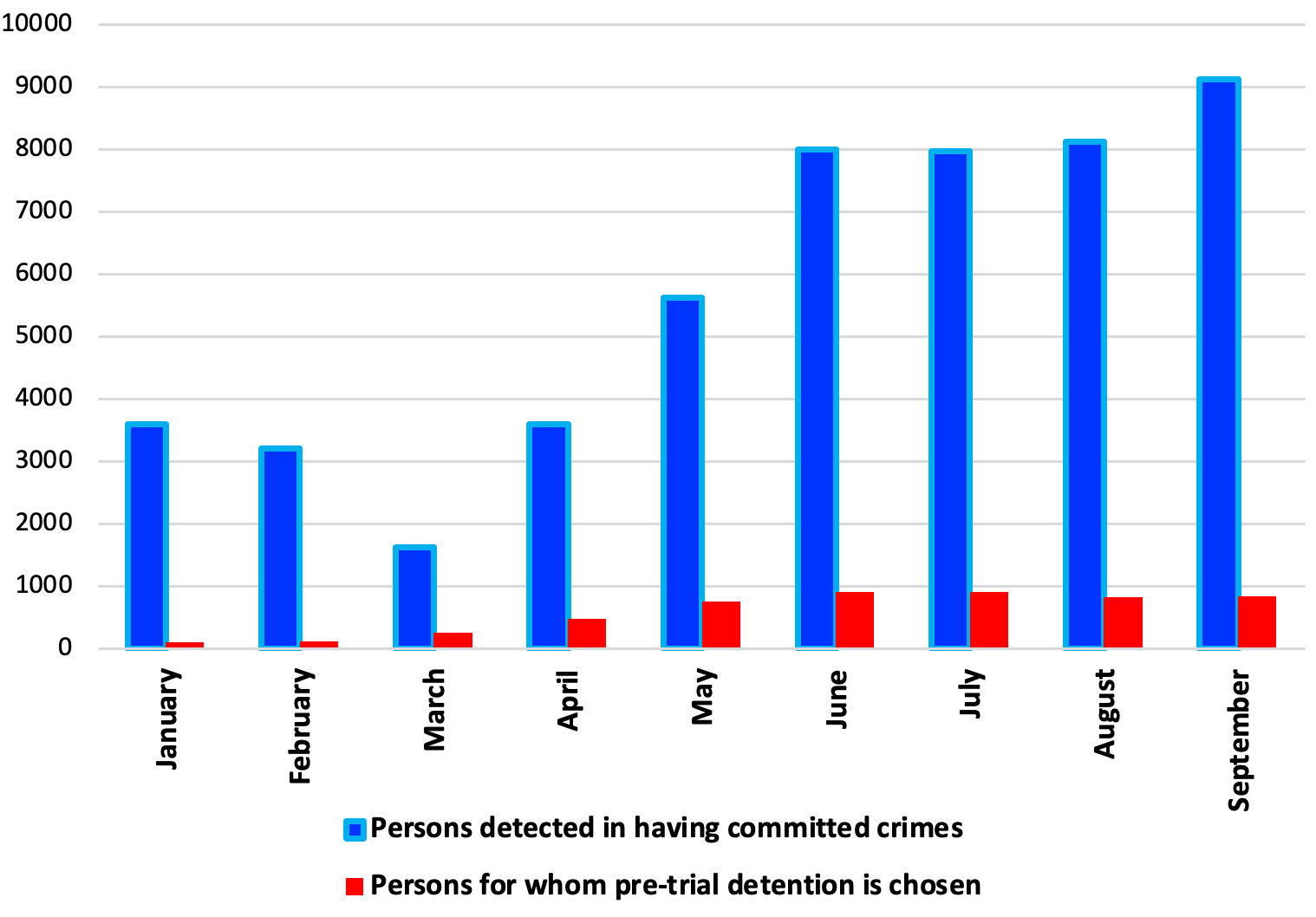 In the period of nine months of 2022, there has been a permanent trend of increasing of suspects arrested during pre-trail investigation even in absolute numbers.