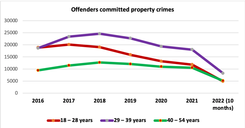В якості прикладу, передусім, можна продемонструвати кількість осіб, які вчинили злочини проти власності, де початок 2022 року демонструє різке зниження таких осіб.
