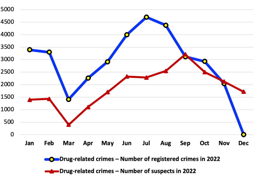 The graph showing the monthly numbers of registered drug-related crimes in 2022 proves the artificial nature of the fight against drug crime, which is especially evident in the fact that the number of criminal proceedings opened in December 2022 is zero.