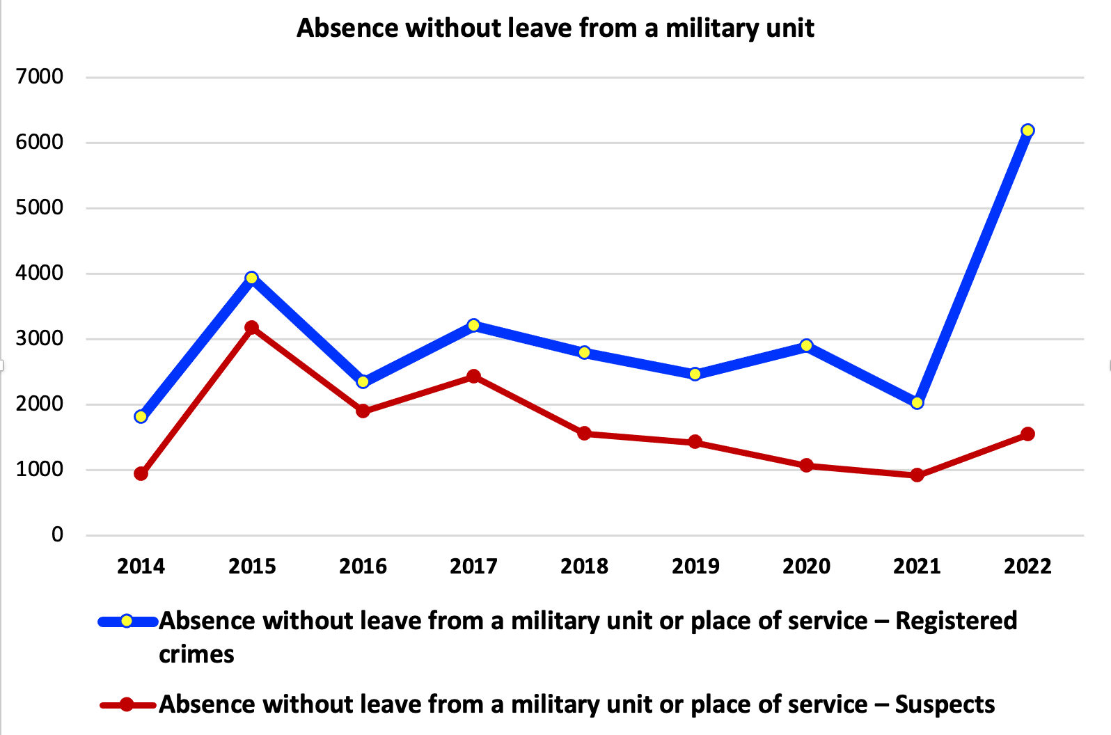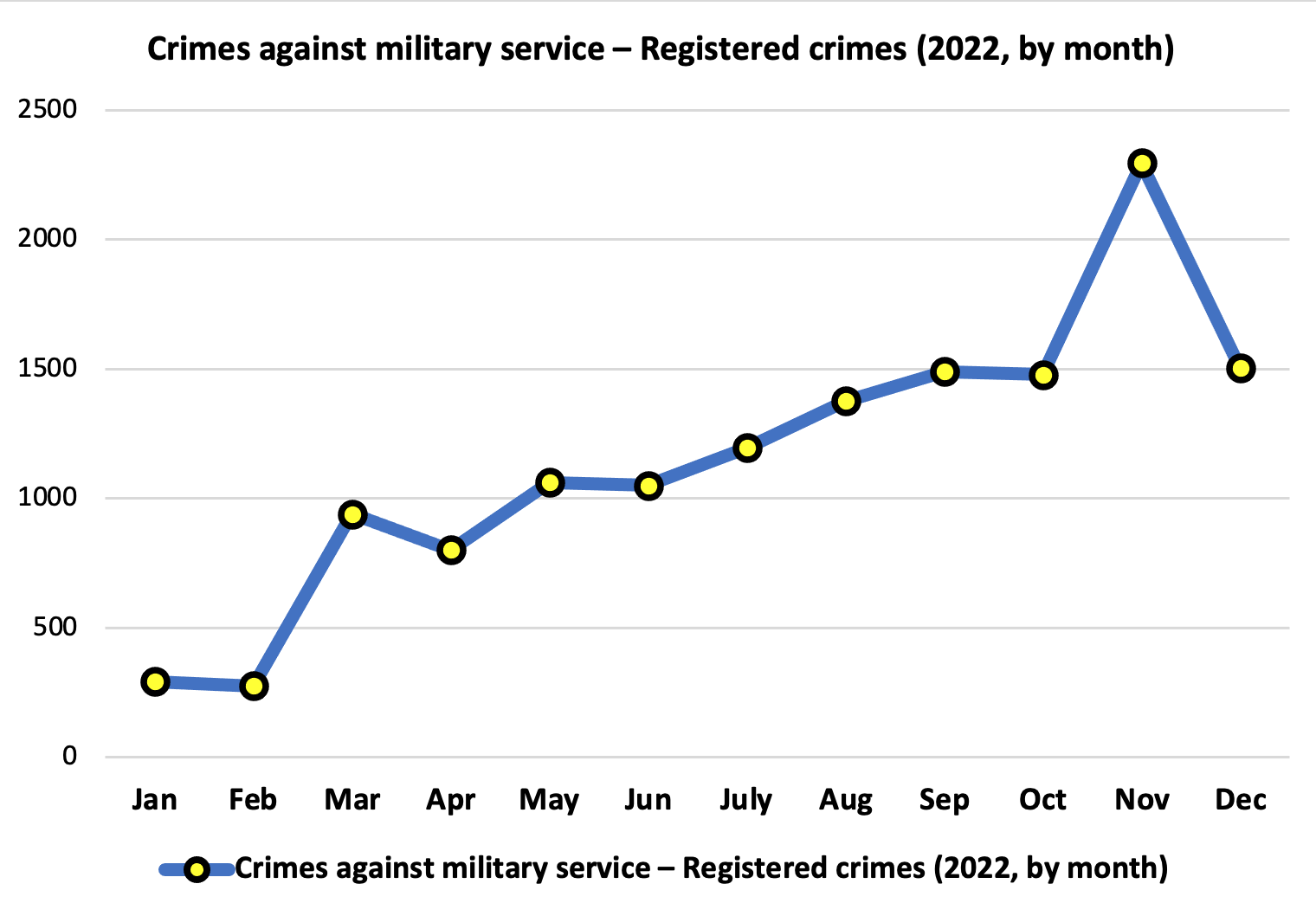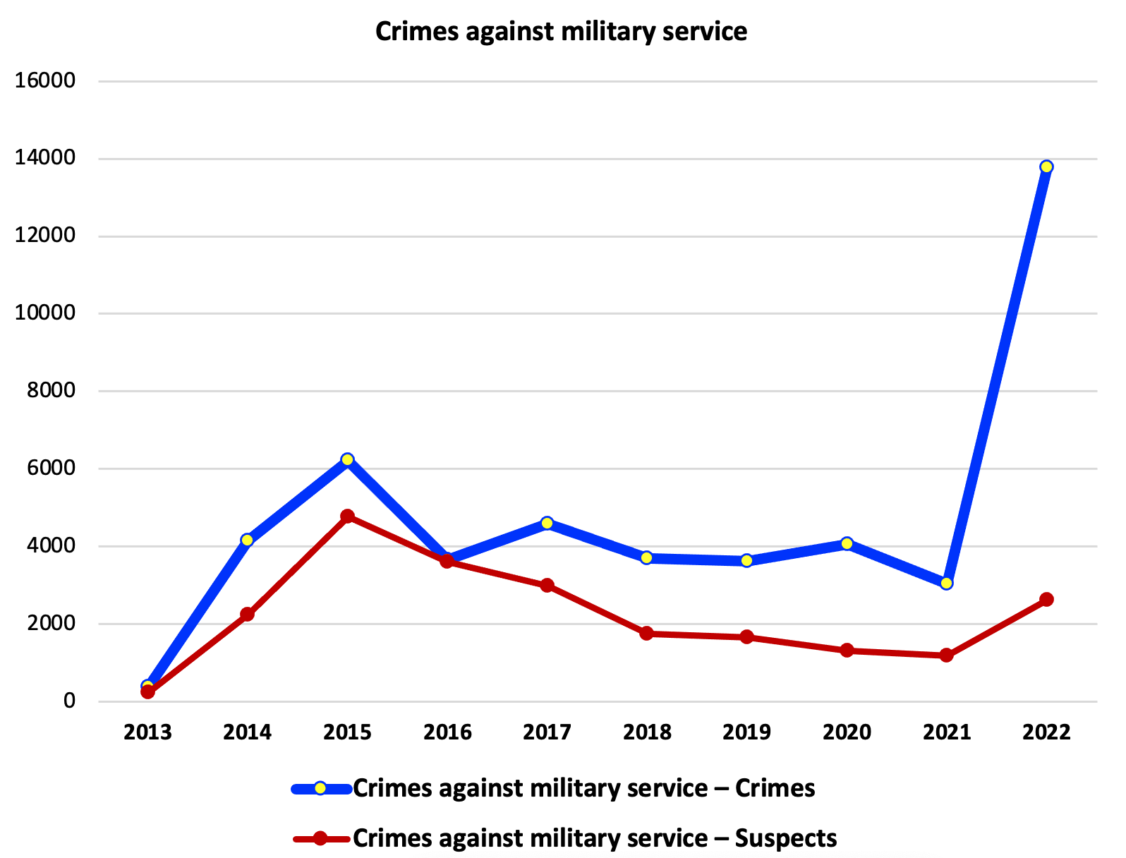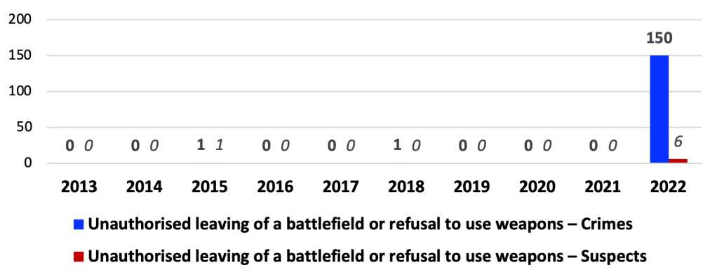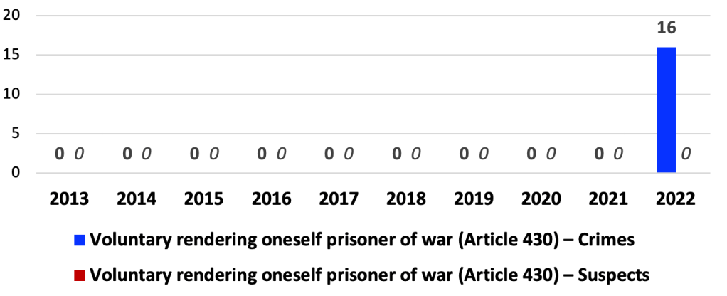 It can be noted that crimes against military service during the period 2016 – 2021 were within reasonable limits with a slight downward trend in 2021. It is quite expected that in 2022 the number of crimes against the military service “jumped” sharply, which cannot be said for the number of criminal proceedings in which the suspicion was reported.