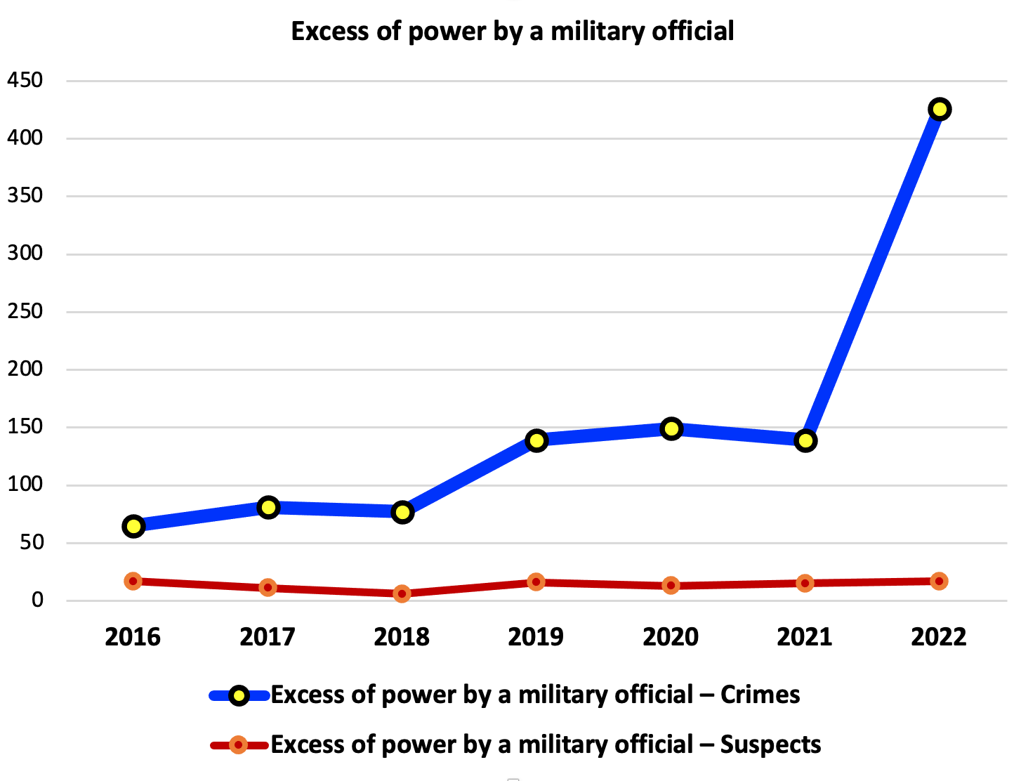 No fewer interesting conclusions could be drawn from the analysis of crime foreseen by Article 426-1 of the Criminal Code of Ukraine (Excess of power or official authority by a military official). While in 2016, 65 crimes were registered with 17 suspects, in 2022 we can observe the increase in the distance between number of crimes and number of suspects.