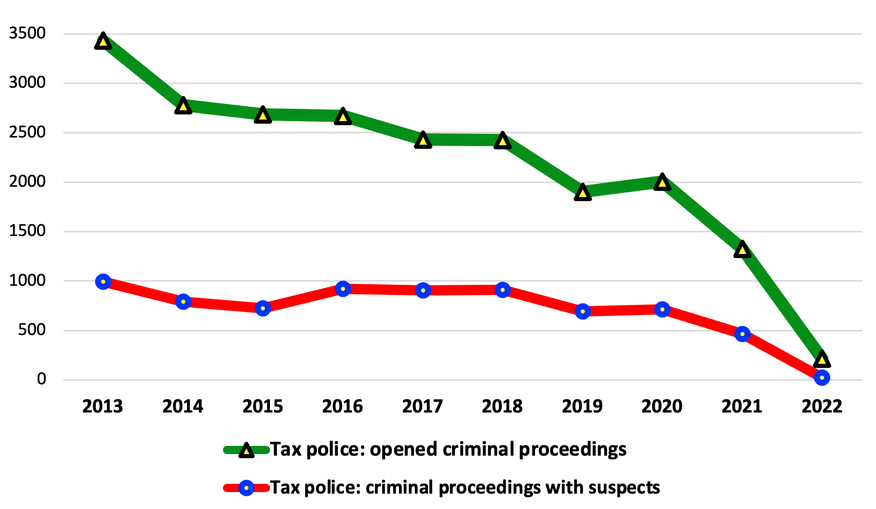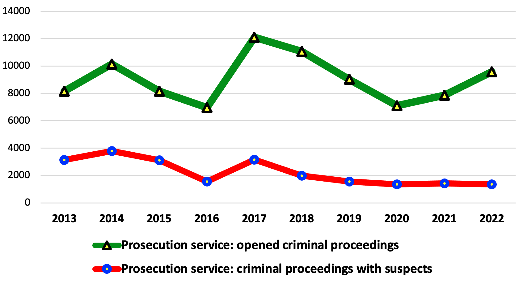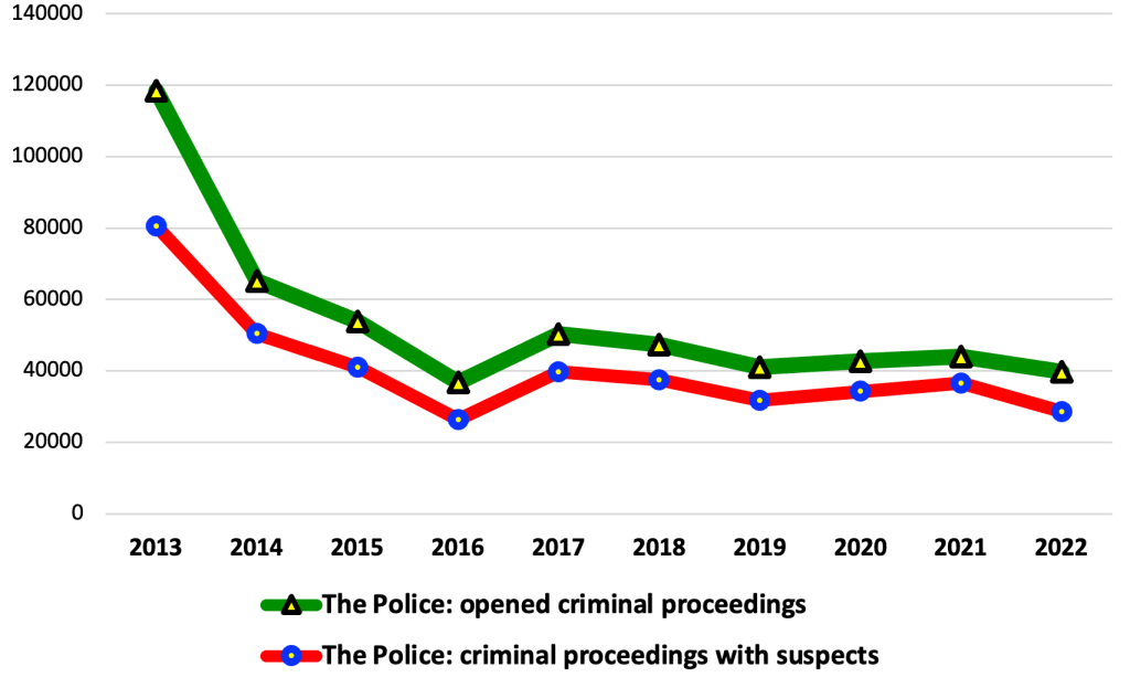 In 2022, the police registered 39800 criminal proceedings (28633 criminal proceedings with concrete suspects), which is less than in 2021 (44027 criminal proceedings, of which there were 36562 criminal proceedings with suspects).