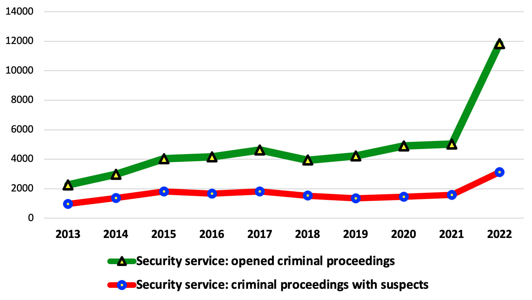 Водночас з вельми зрозумілих причин Служба безпеки України зареєструвала у 2022 році набагато більше кримінальних проваджень (11841), у той час коли у 2021 році кримінальних проваджень було зареєстровано лише 5035.