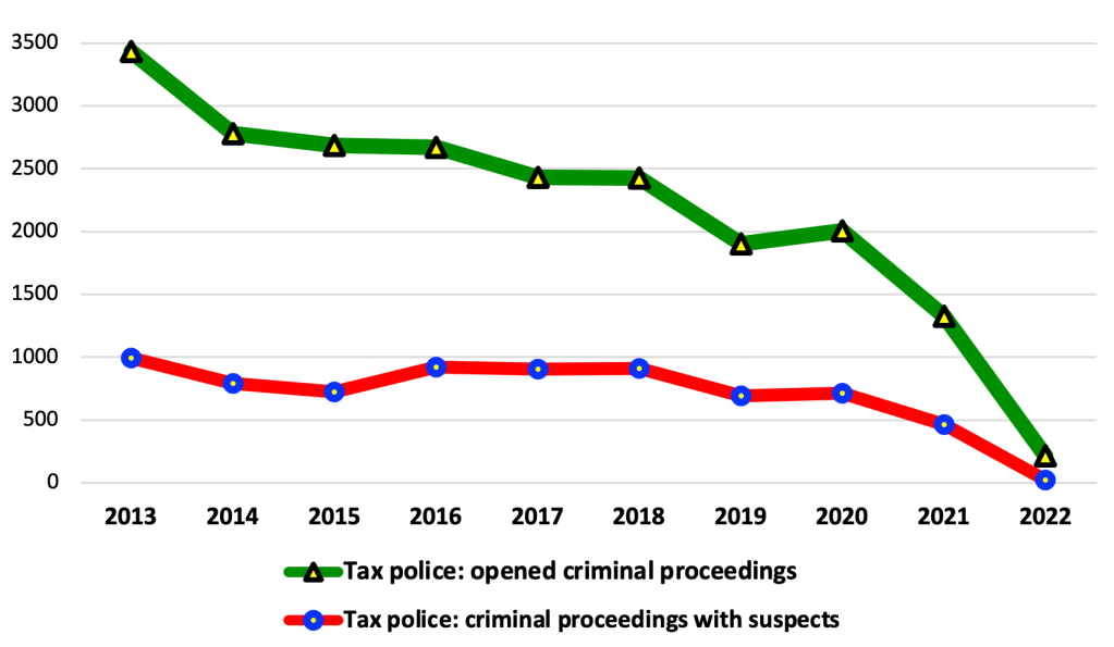 If we talk about the performance indicators of the tax police, then for objective reasons the indicators have reached almost zero level (especially criminal proceedings with suspects).