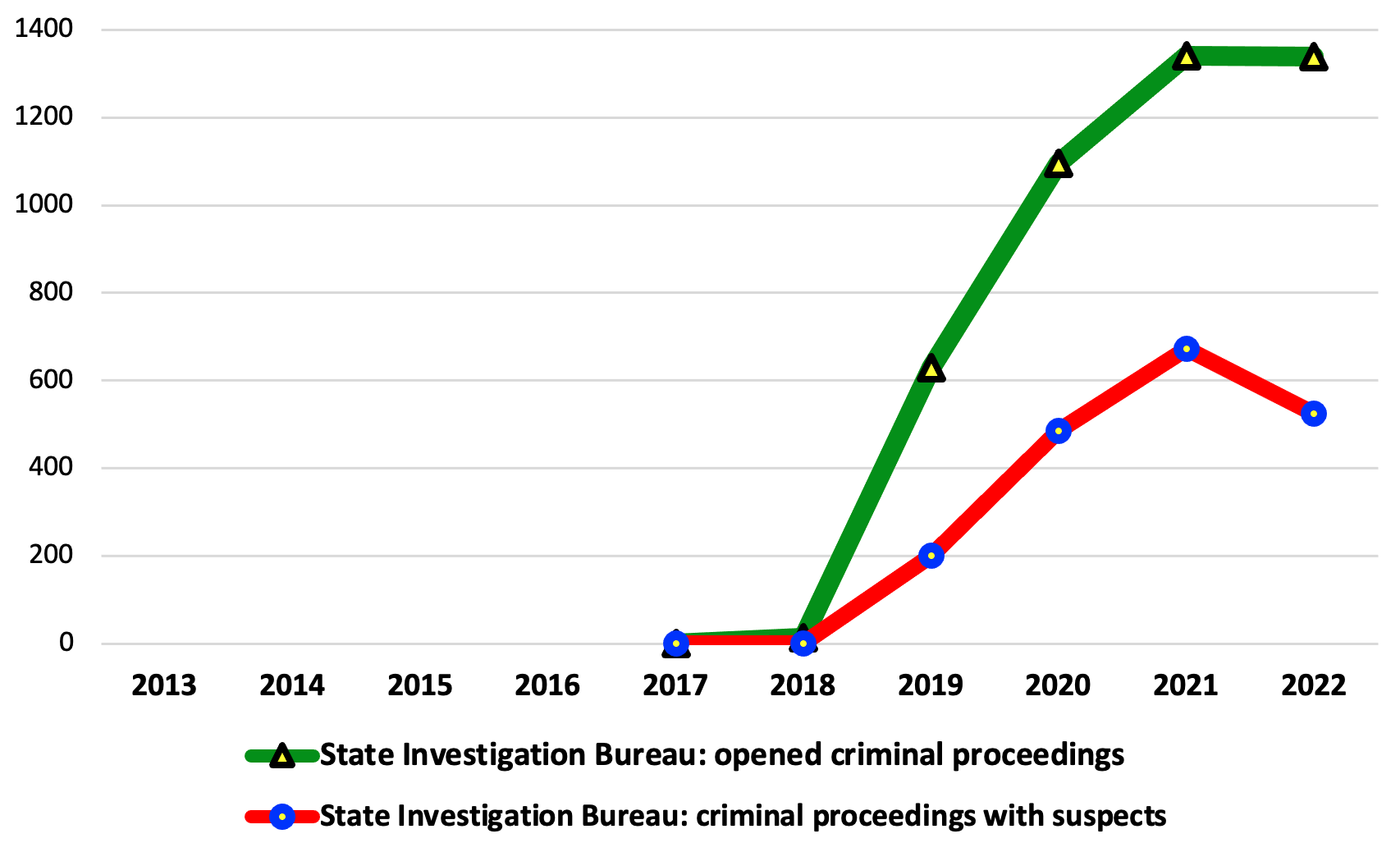 Since 2017, statistics on the results of crime investigations by investigators of the State Bureau of Investigation began to be published, which show quite indicative results. Thus, despite the annual increase in the number of registered criminal proceedings, the ratio between the total number of cases and cases with suspects increased every year, which proves the thesis of the transformation of the State Bureau of Investigation into a body investigating mainly “factual” cases. At the same time, the War actually left the indicators at the same level as last year (1341 criminal proceedings in 2021, 1130 criminal proceedings in 2022). At the same time, the beginning of the War further increased the distance between actual criminal proceedings and criminal proceedings with specific suspects (2021 – 672 criminal proceedings with suspects, 2022 – 525 criminal proceedings with suspects).