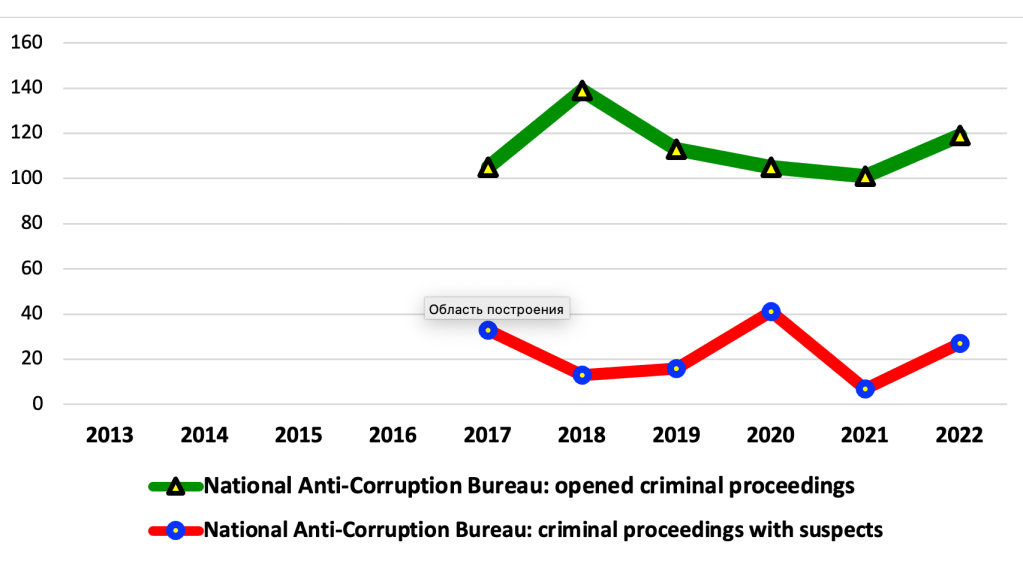 The National Anti-Corruption Bureau of Ukraine, on the contrary, demonstrated an increase in both the total number of criminal proceedings and the number of criminal proceedings involving suspects. In general, the National Anti-Corruption Bureau of Ukraine has demonstrated stability in both indicators since its establishment, which the war does not seem to have affected.