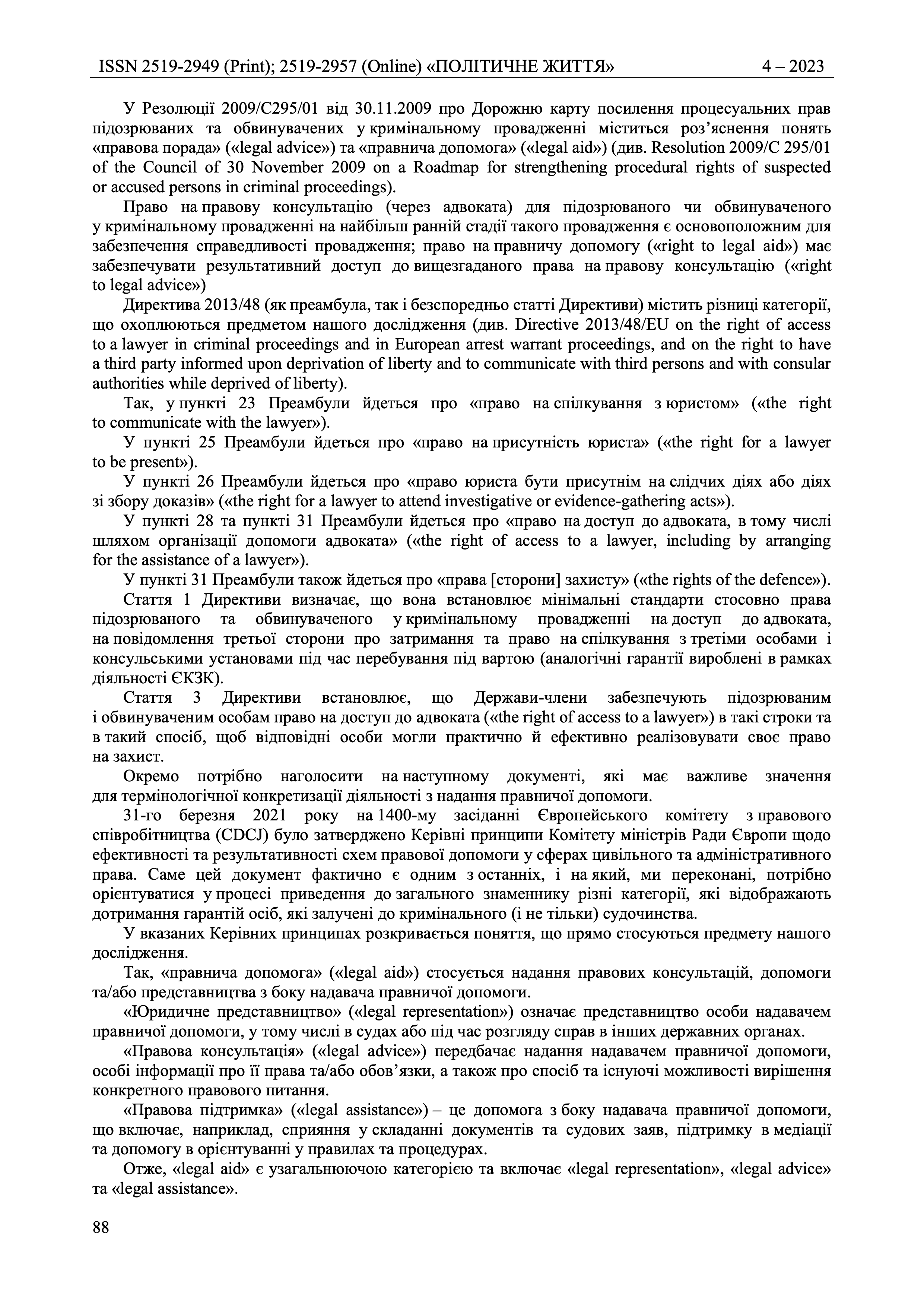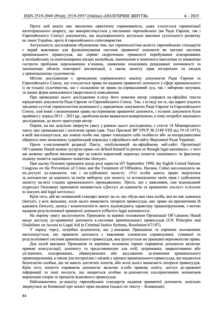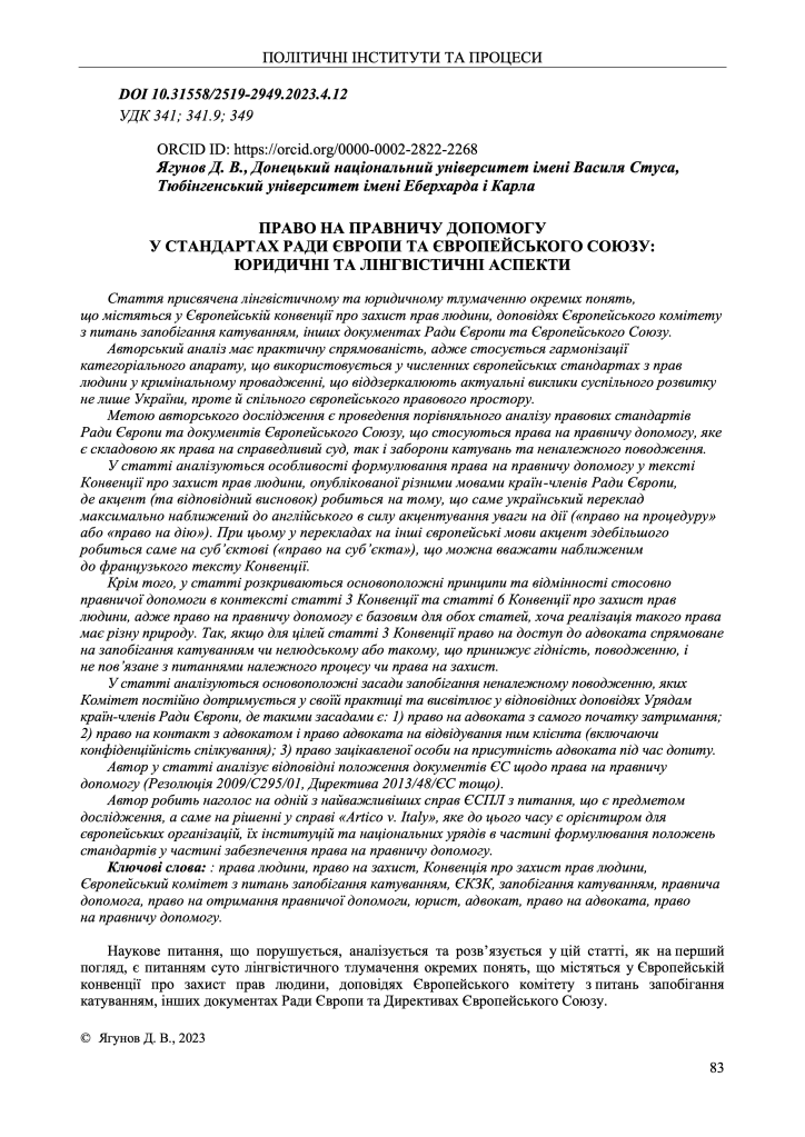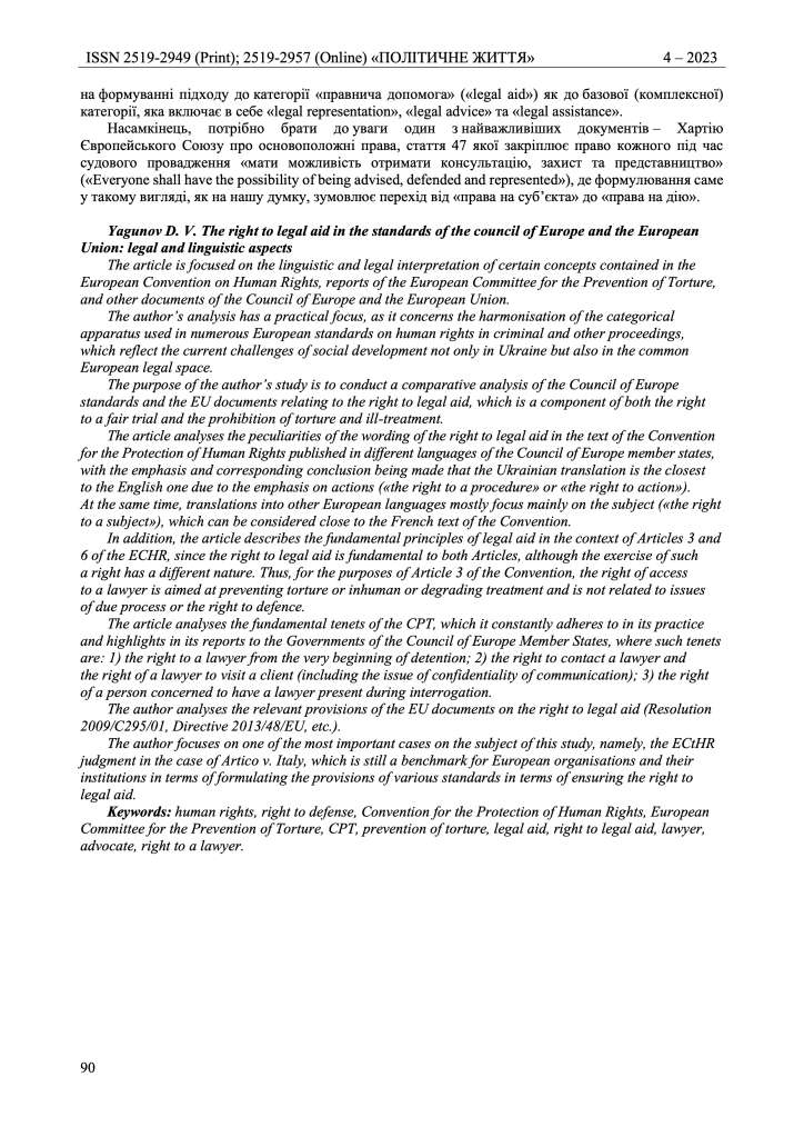 In addition, the article describes the fundamental principles of legal aid in the context of Articles 3 and 6 of the ECHR, since the right to legal aid is fundamental to both Articles, although the exercise of such a right has a different nature. Thus, for the purposes of Article 3 of the Convention, the right of access to a lawyer is aimed at preventing torture or inhuman or degrading treatment and is not related to issues of due process or the right to defence.
