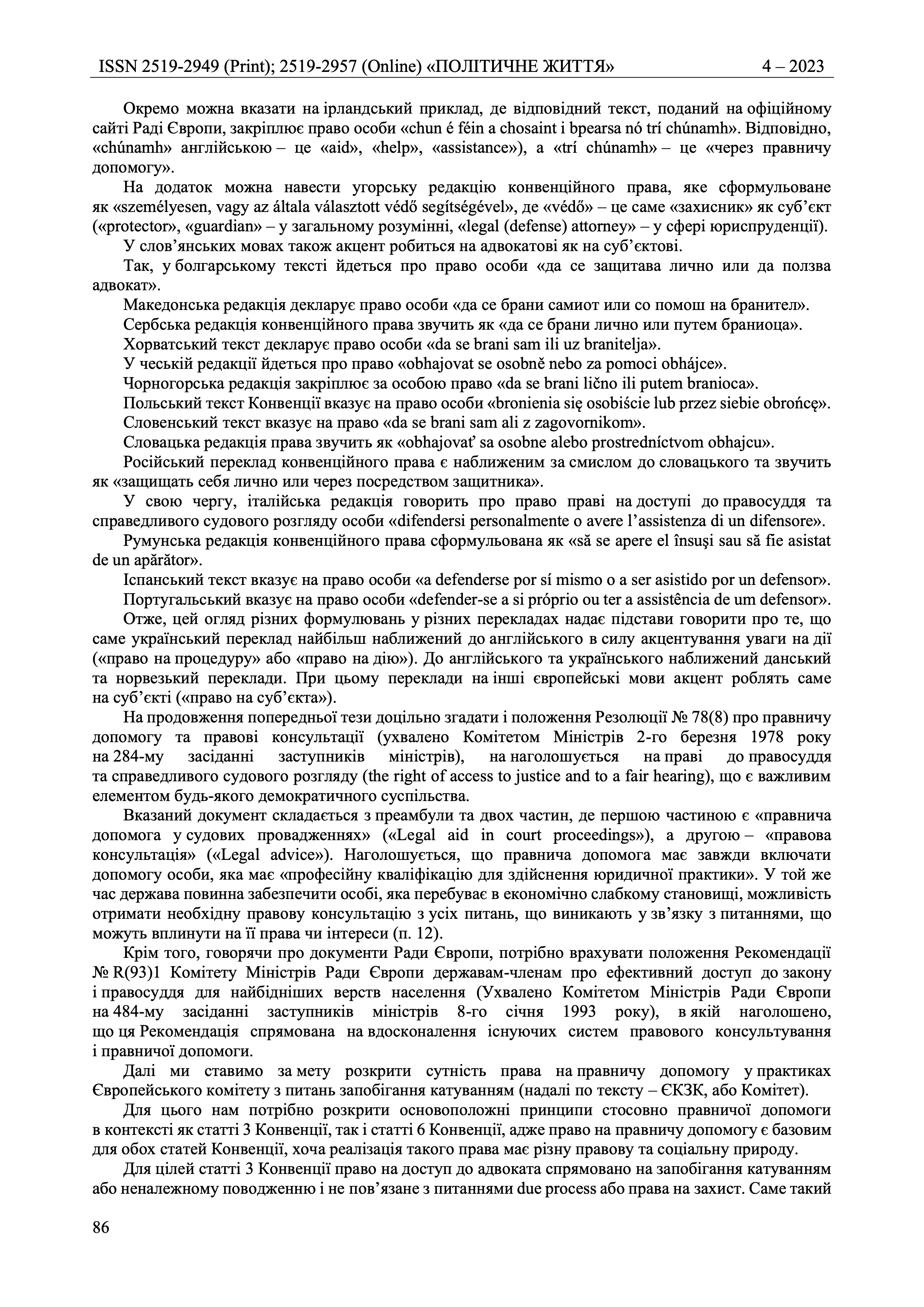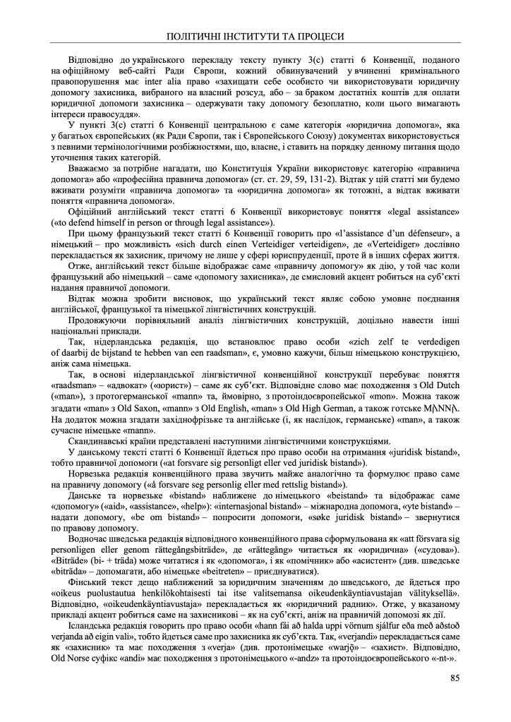 The article analyses the peculiarities of the wording of the right to legal aid in the text of the Convention for the Protection of Human Rights published in different languages of the Council of Europe member states, with the emphasis and corresponding conclusion being made that the Ukrainian translation is the closest to the English one due to the emphasis on actions («the right to a procedure» or «the right to action»). At the same time, translations into other European languages mostly focus mainly on the subject («the right to a subject»), which can be considered close to the French text of the Convention.