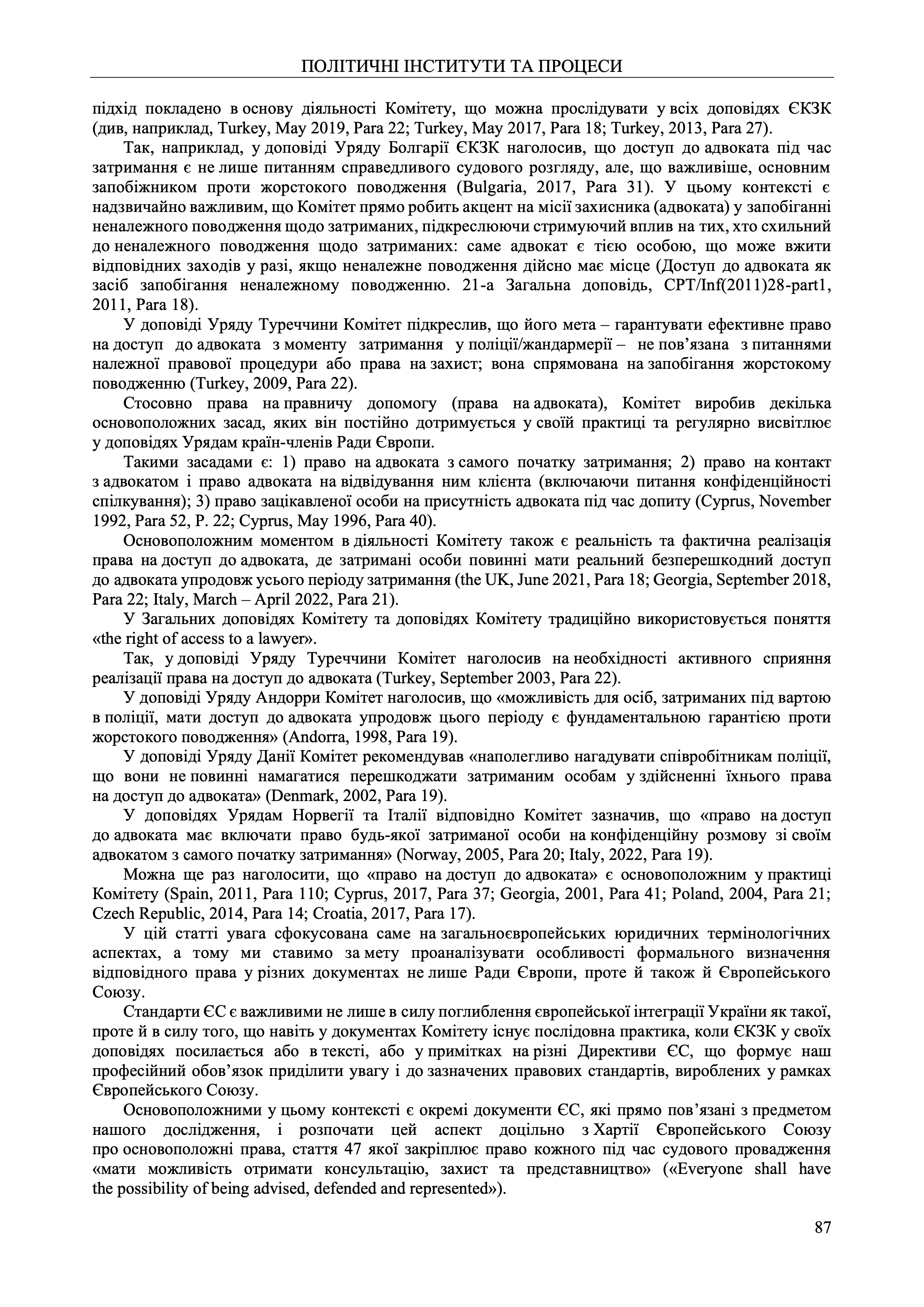 The article analyses the fundamental tenets of the CPT, which it constantly adheres to in its practice and highlights in its reports to the Governments of the Council of Europe Member States, where such tenets are: 1) the right to a lawyer from the very beginning of detention; 2) the right to contact a lawyer and the right of a lawyer to visit a client (including the issue of confidentiality of communication); 3) the right of a person concerned to have a lawyer present during interrogation.