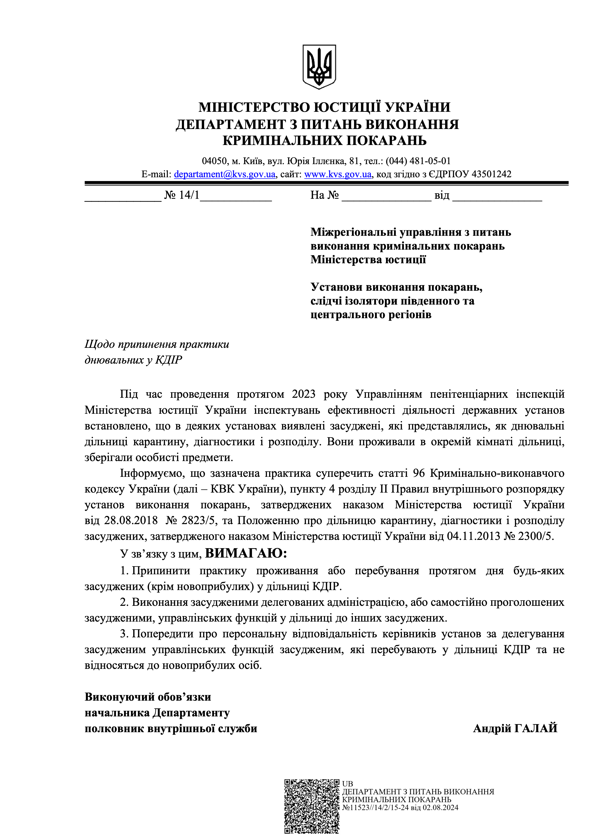 02 серпня 2024 року Департамент з питань виконання кримінальних покарань Міністерства юстиції України оприлюднив невеликий, але вкрай важливий документ, яким ще раз нагадав посадовим особам установ виконання покарань припинити практику проживання або перебування протягом дня будь-яких засуджених (крім новоприбулих) у дільниці карантину, діагностики і розподілу.