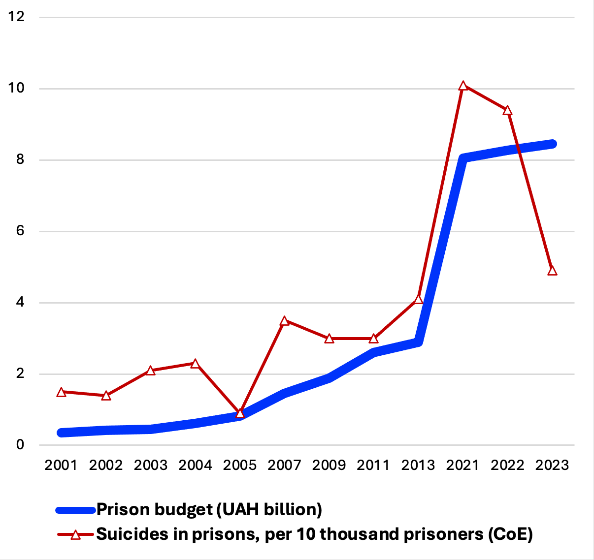 | Year | Prison budget (UAH billion) | Suicides in prisons, per 10 thousand prisoners (CoE) |