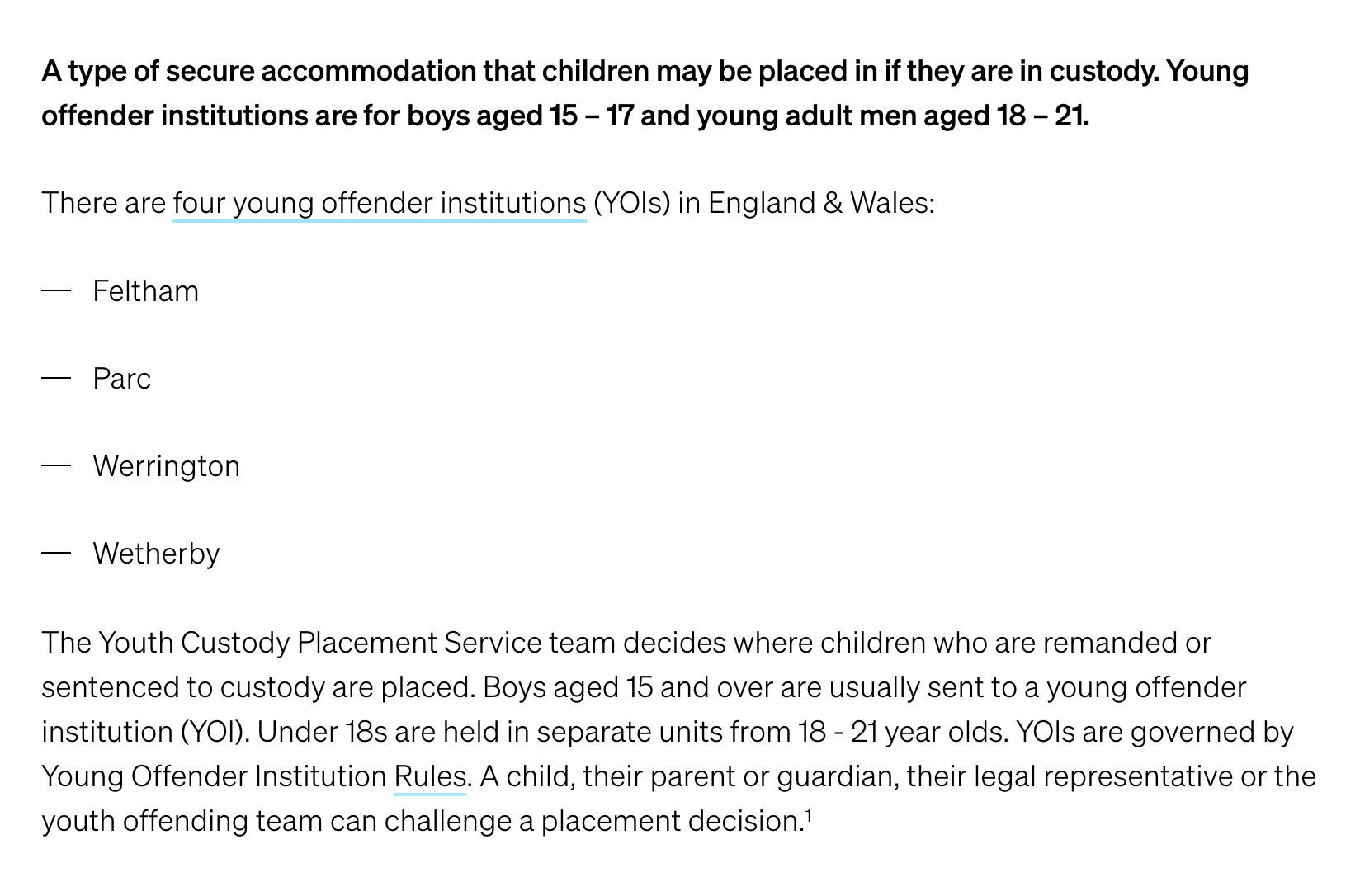 В середньому, в таких установах утримується 440 неповнолітніх правопорушників, і розлучення часто використовується як метод покарання або за власним бажанням тих, хто боїться насильства. Майже дві третини (64%) дітей заявили, що вони зазнали ізоляції, згідно з доповіддю Інспекції в’язниць Великої Британії (HM Inspectorate of Prisons). Найвищий показник (76%) був виявлений у Кукхем Вуд – установі, яка після критики за поводження з малолітніми ув’язненими має бути перепрофільована у в’язницю для дорослих.