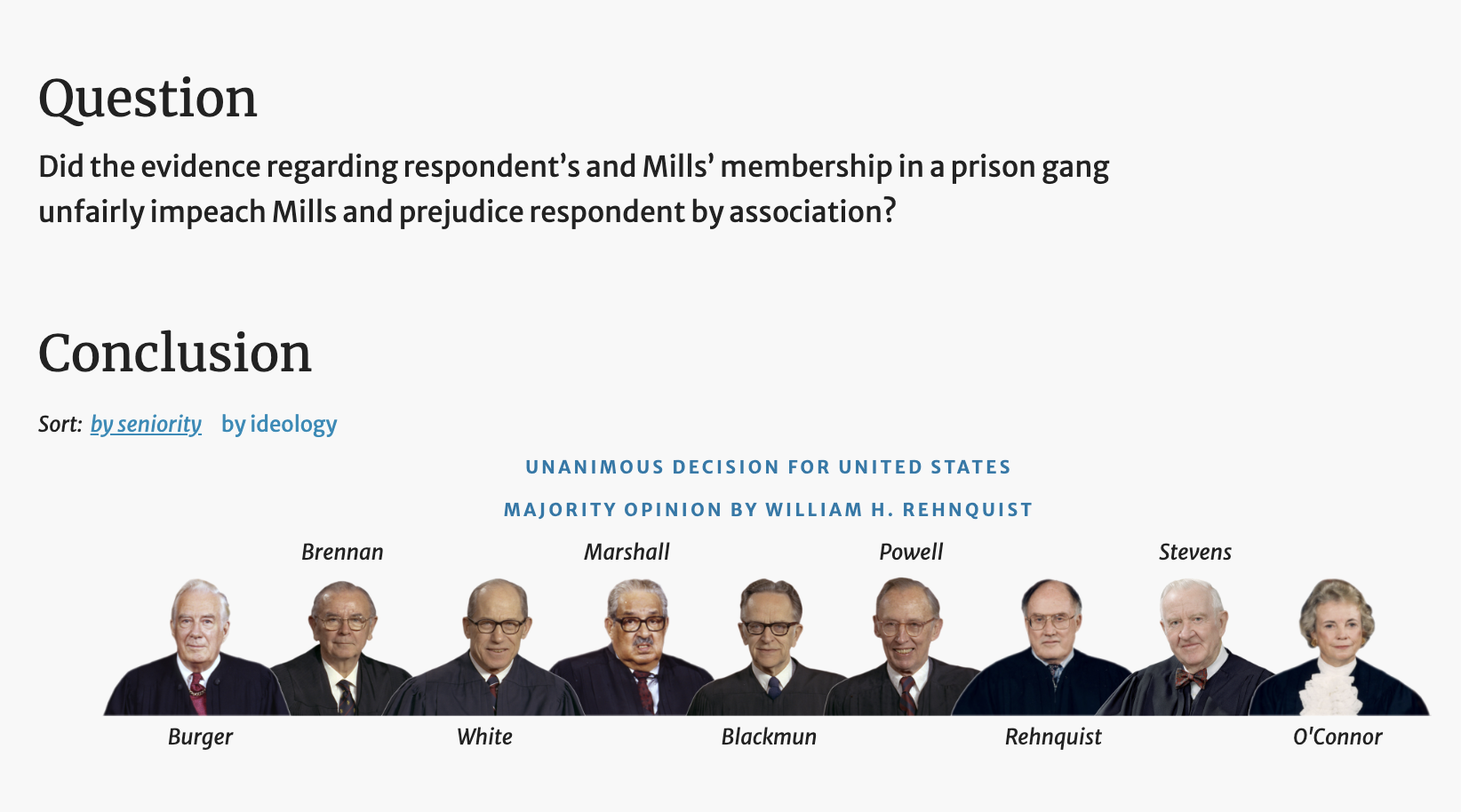 (c) Перехресний допит Міллса про в’язничну банду, щоб показати, окрім упередженості Міллса, його членство в банді в минулому, яке впливає на його правдивість, не було помилкою відповідно до Федерального правила доказів 608(b), яке дозволяє перехресний допитусвідка, запитуючи його про конкретні випадки його поведінки в минулому, окрім злочинів, охоплених правилом 609, які можуть свідчити про його правдивість, а також про його упередженість щодо в’язничної банди. Також не було помилкою згідно з правилом 608(b) прийняти до розгляду спростувальні свідчення Еле щодо банди. Наданих свідчень щодо членства Міллса у банді було достатньо, щоб показати потенційну упередженість на користь відповідача, а такі зовнішні докази є прийнятними для того, щоб показати упередженість. Це правда, що через принципи банди, які описувалися в свідченнях, свідчення також могли б поставити під сумнів правдивість Міллса безпосередньо. Але не існує правила доказування, яке б передбачало, що свідчення, прийнятні для однієї мети і неприйнятні для іншої, таким чином стають неприйнятними.