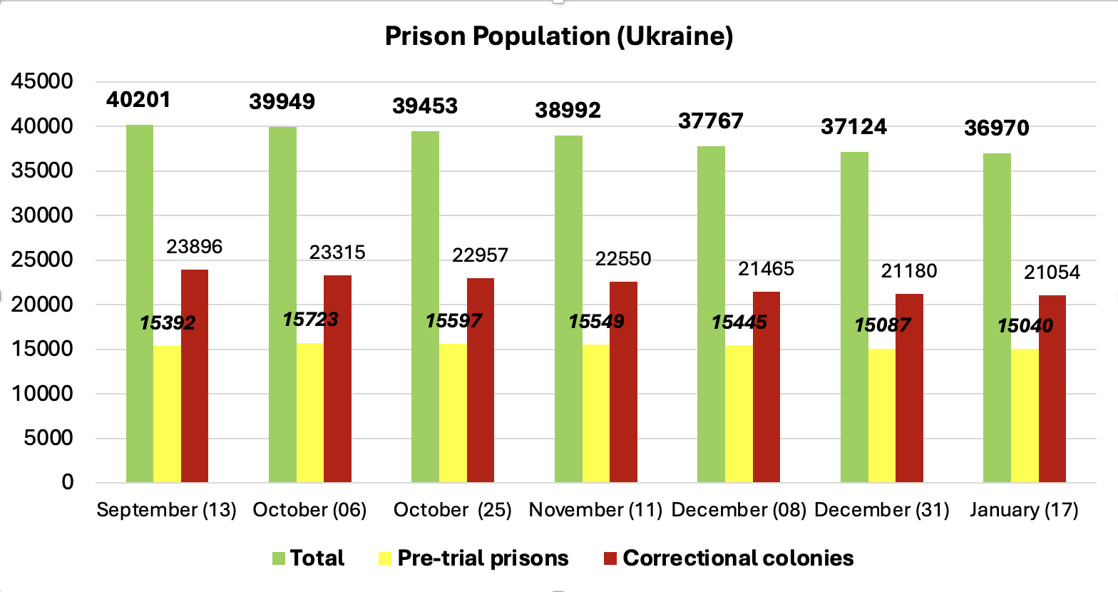 Станом на 17.01.2025 у пенітенціарних установах України утримувалося 36970 осіб: