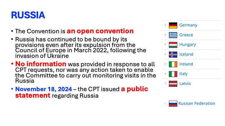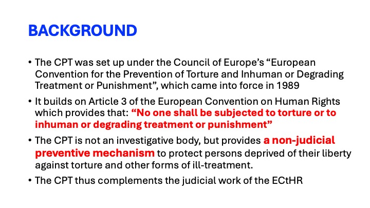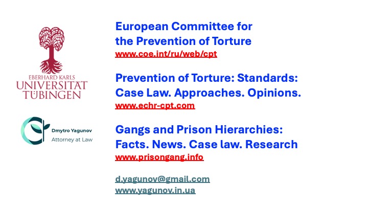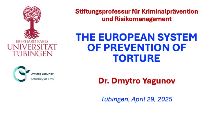 Dmytro Yagunov: The European System of Prevention of Torture Dmytro Yagunov29 Квітня, 202529 Квітня, 2025Azerbaijan, Case law, cpt, CPT Reports, Dmytro Yagunov / Дмитро Ягунов, ЄКЗК, ЄСПЛ, Європейський суд з прав людини, Азербайджан, Дмитро Ягунов, Доповідь, Запобігання катуванням, Презентація, Росія, Україна, Ягунов Дмитро Вікторович, ECHR Case Law, ECtHR, European Court of Human Rights, prevention-of-torture, Prison violence and torture, Reports, Research, Russia, Russian invasion of Ukraine, Torture Prevention, Ukraine, Victims of torture Навігація по запису НазадДалі Yagunov Torture 29 04 2025Завантажити Поширити це: Натисніть, щоб поширити у X (Відкривається у новому вікні) X Натисніть щоб поширити через Facebook (Відкривається у новому вікні) Facebook Подобається Завантаження… Пов’язано