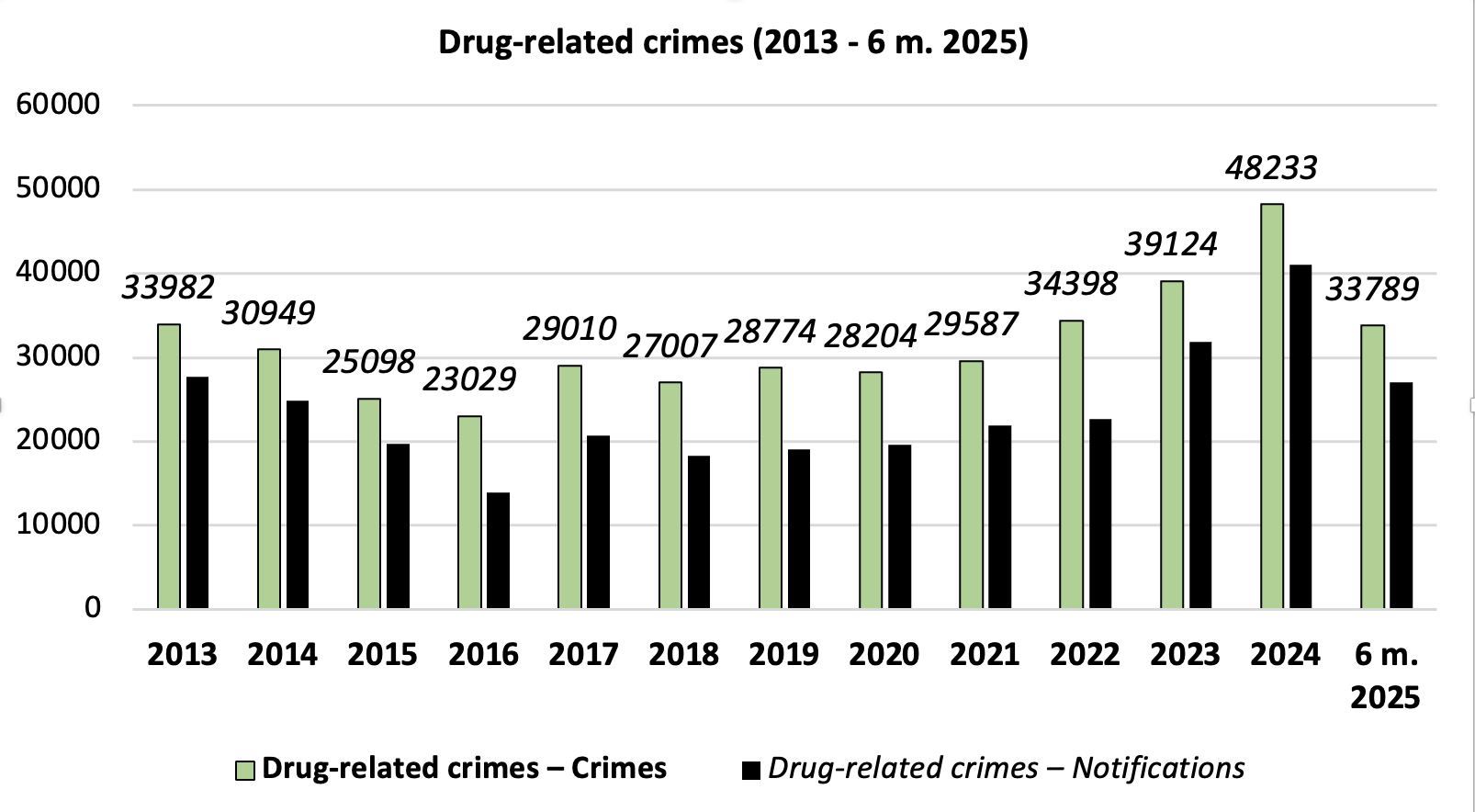 Поліцейська стаитистика за 2022 рік свідчить, що у 2022 році вже скоєно 34398 злочинів, пов’язаних з наркотиками. У 2023 році поліція зареєструвала 39124 злочини, пов’язані з наркотиками. У 2024 році поліція зареєструвала 48233 злочини, пов’язані з наркотиками.