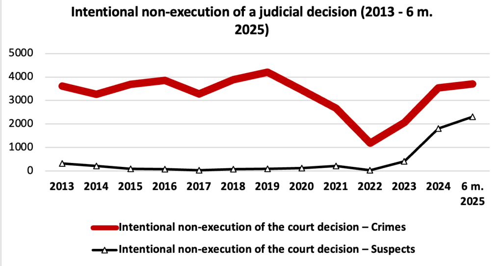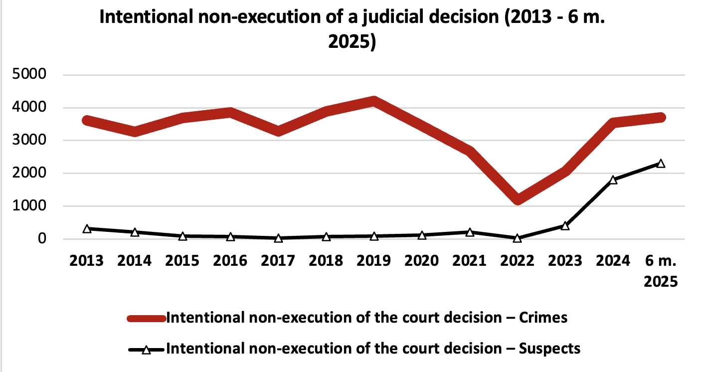 Якщо 2021 рік був винятком, то протягом усього періоду 2013-2024 років кількість кримінальних проваджень, порушених за статтею 382 Кримінального кодексу, коливалася приблизно на одному рівні, досягнувши найвищої позначки у 2019 році (4212 зареєстрованих злочинів проти правосуддя), після чого кількість зареєстрованих злочинів проти правосуддя зазначеного виду почала послідовно зменшуватися.