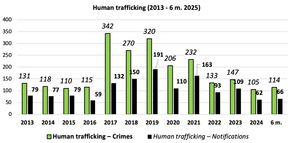 Це означає, що кількість злочинів, пов’язаних з торгівлею людьми, зареєстрованих за шість місяців 2025 року, на 109% більша, ніж за весь 2024 рік.