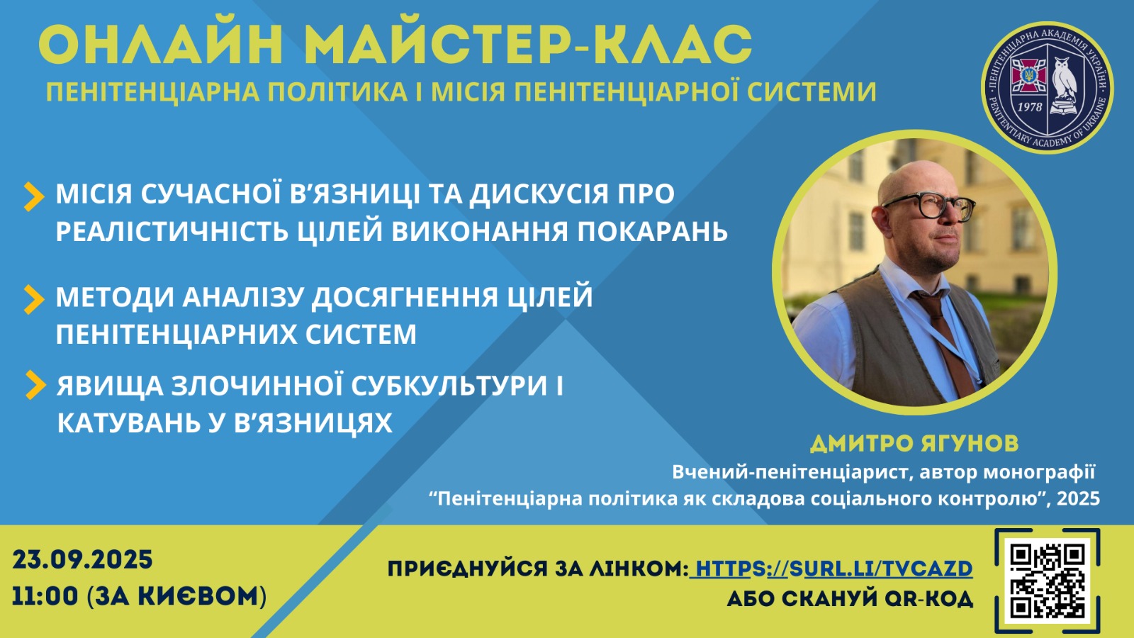 Саме цим аспектам буде присвячено майстер-клас Дмитра Ягунова, автора нової монографії «Пенітенціарна політика як складова соціального контролю» (2025).