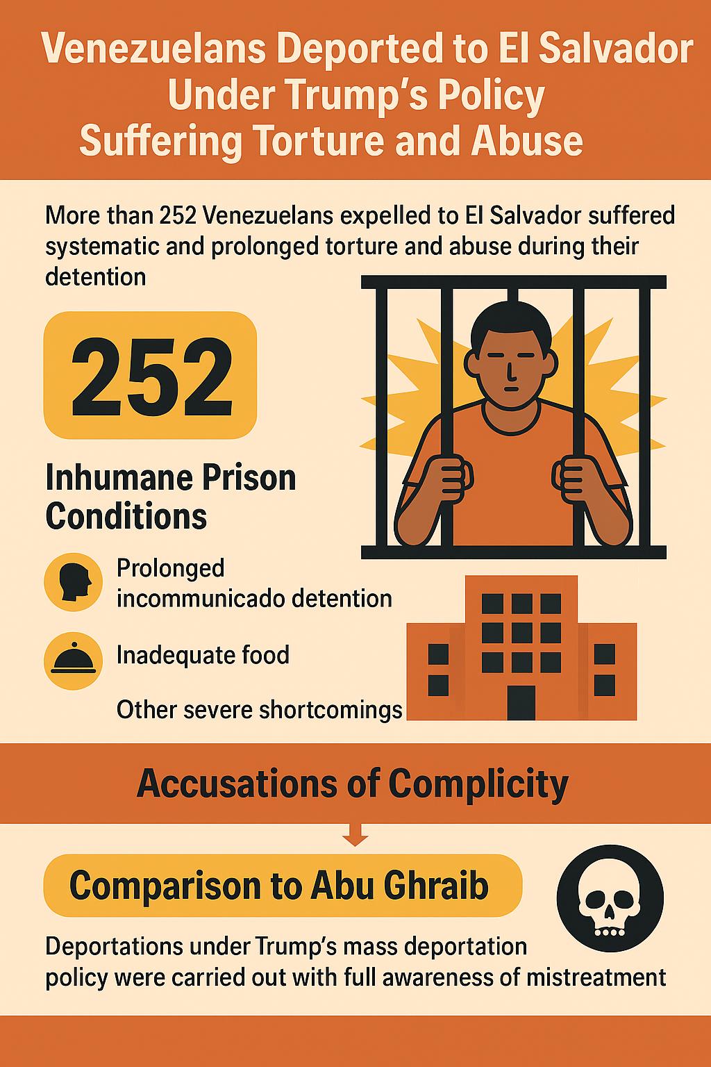 Групи звинувачують адміністрацію Трампа у свідомому співучасті у стражданнях депортованих осіб після їх перевезення до Сальвадору в березні та квітні, наполягаючи на тому, що чиновники наказали депортувати цих чоловіків, повністю усвідомлюючи, що вони будуть піддані жорстокому поводженню або загрозі для їхнього життя. Вони закликають до незалежного розслідування з боку Міністерства юстиції США, хоча визнають, що така перспектива є малоймовірною, і вимагають від адміністрації Трампа припинити депортацію громадян третіх країн до Сальвадору. Потурання США тому, що описується як систематична практика тортур і порушень прав людини, викликає порівняння зі скандалом у в’язниці Абу-Грейб у Багдаді під час війни з тероризмом.
