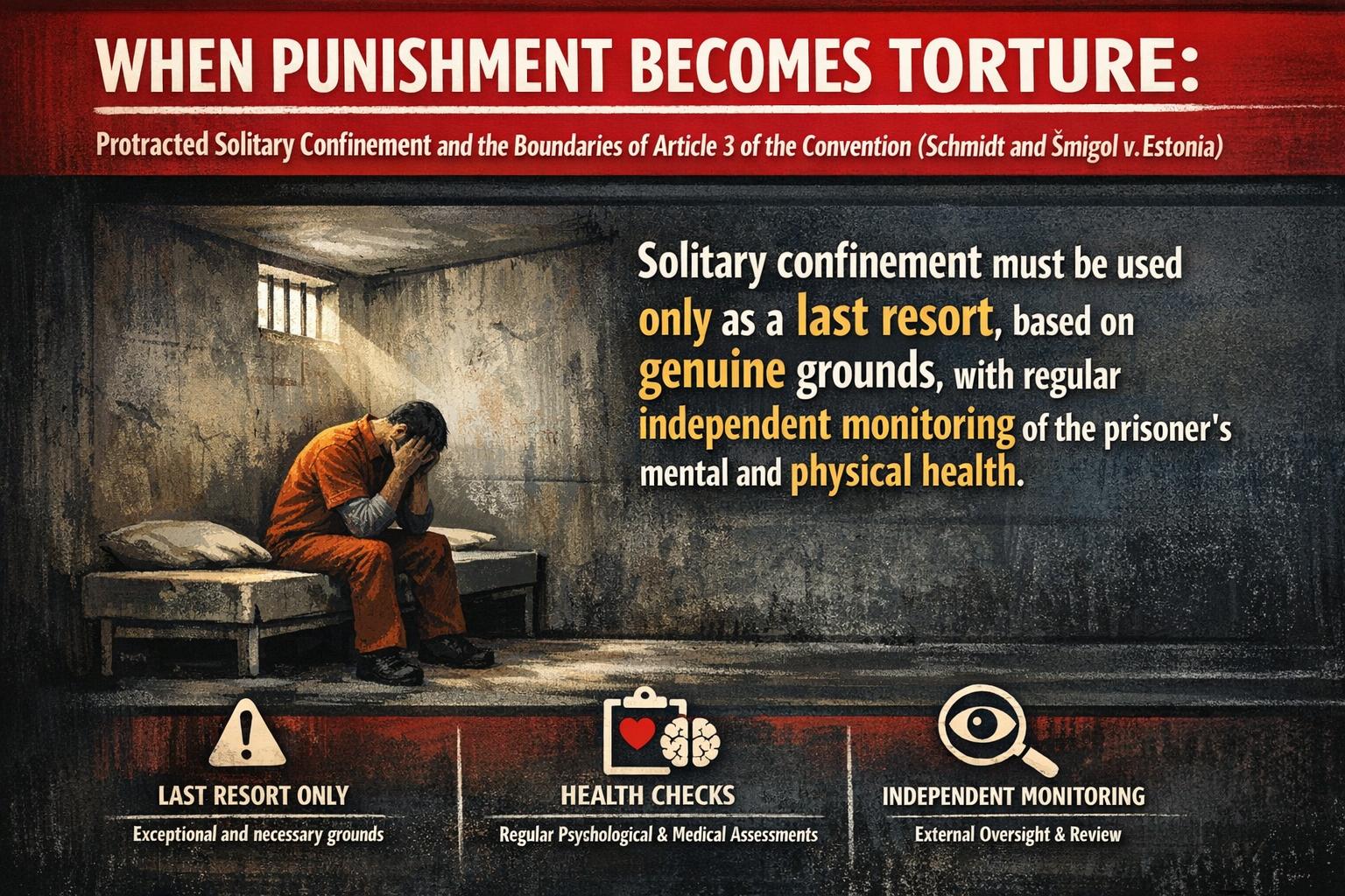 Загальновизнано, що одиночне ув’язнення повинно застосовуватися лише у виняткових випадках як крайній захід і на якомога коротший період часу. Це передбачено Правилами Нельсона Мандели, а також Європейськими тюремними правилами.